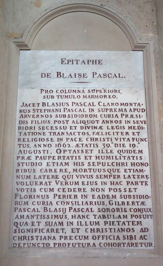 Pascal meurt dans le quartier de la montagne Sainte Geneviève, au 8 de la rue Neuve-Saint-Étienne-du-Mont. Mais surtout, il a été janséniste. Or, Saint-Étienne-du-Mont était une paroisse fortement teintée de jansénisme. Voilà pourquoi on trouve enterré dans l’église Jean Racine et Blaise Pascal, deux jansénistes célèbres !
