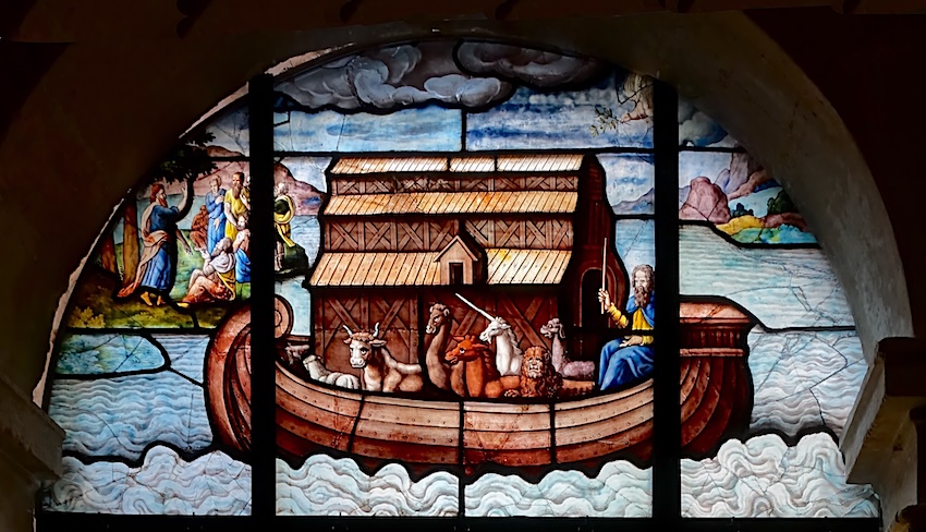 Au registre supérieur : l'arche de Noé, remplie d'animaux dont certains bizarres, et la colombe