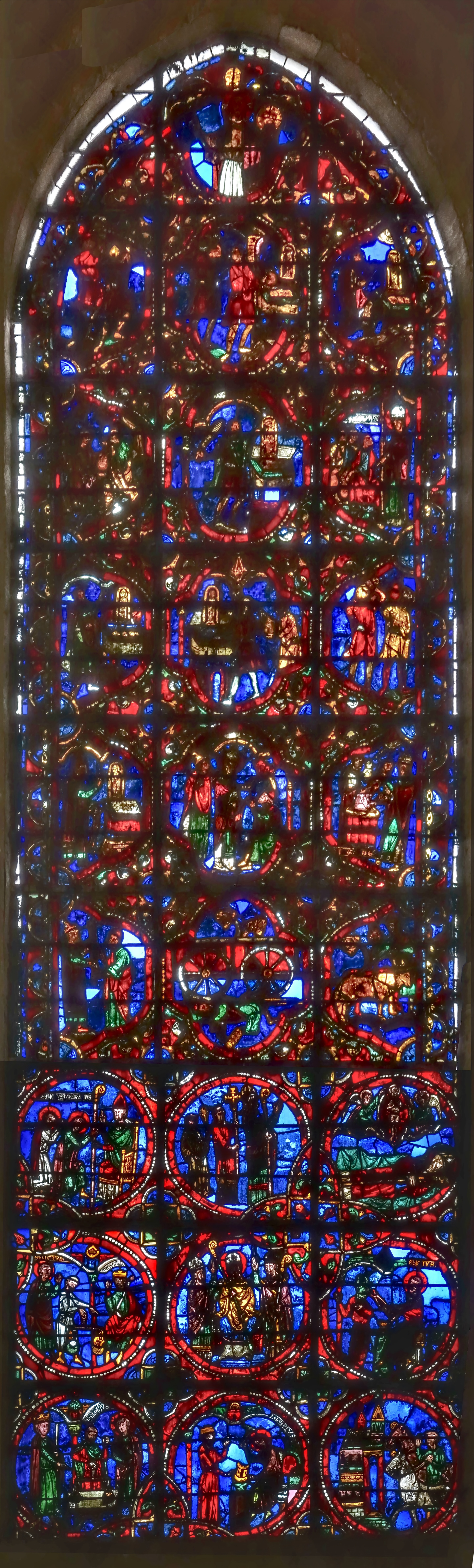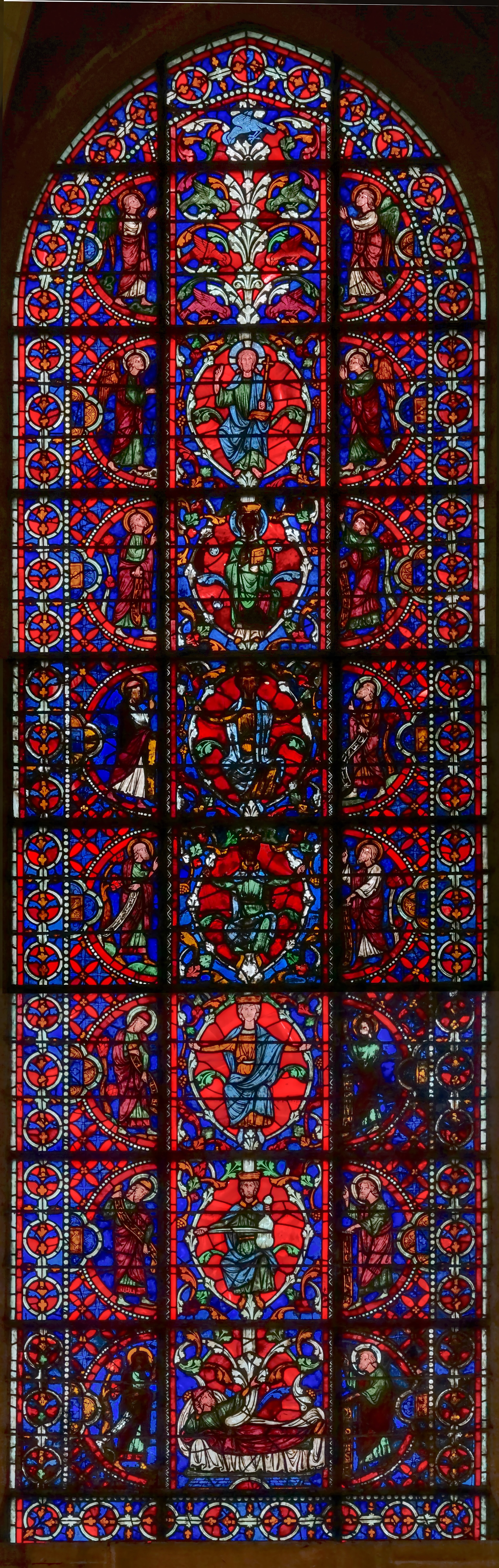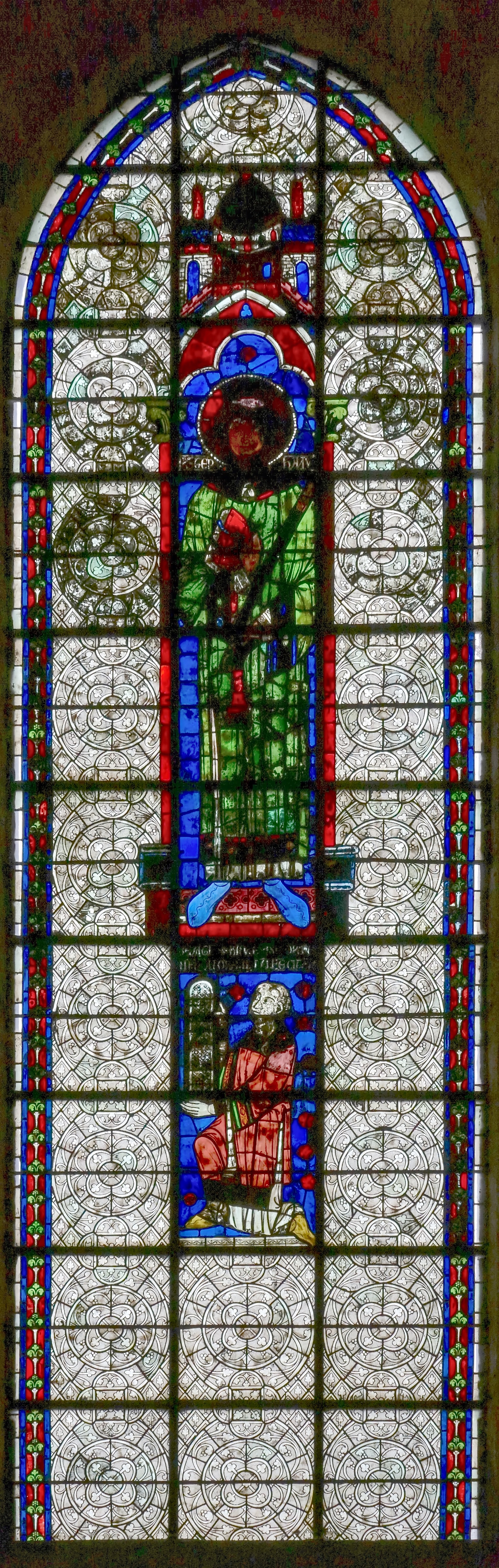 Des vitraux du 13e siècle garnissent les baies du chœur. Dans l'allée nord, l'histoire de David (baie 25), la légende de saint Mammès (baie 23), la création du Monde et la chute de l'Homme (baies 19 et 21), l'histoire de Joseph (baie 17), la légende de sainte Marguerite (baie 15), celle de saint André (baie 13), l'histoire de Samson (baie 11), la légende de saint Laurent (baie 9), Saint Pierre et Saint Paul (baie 7)