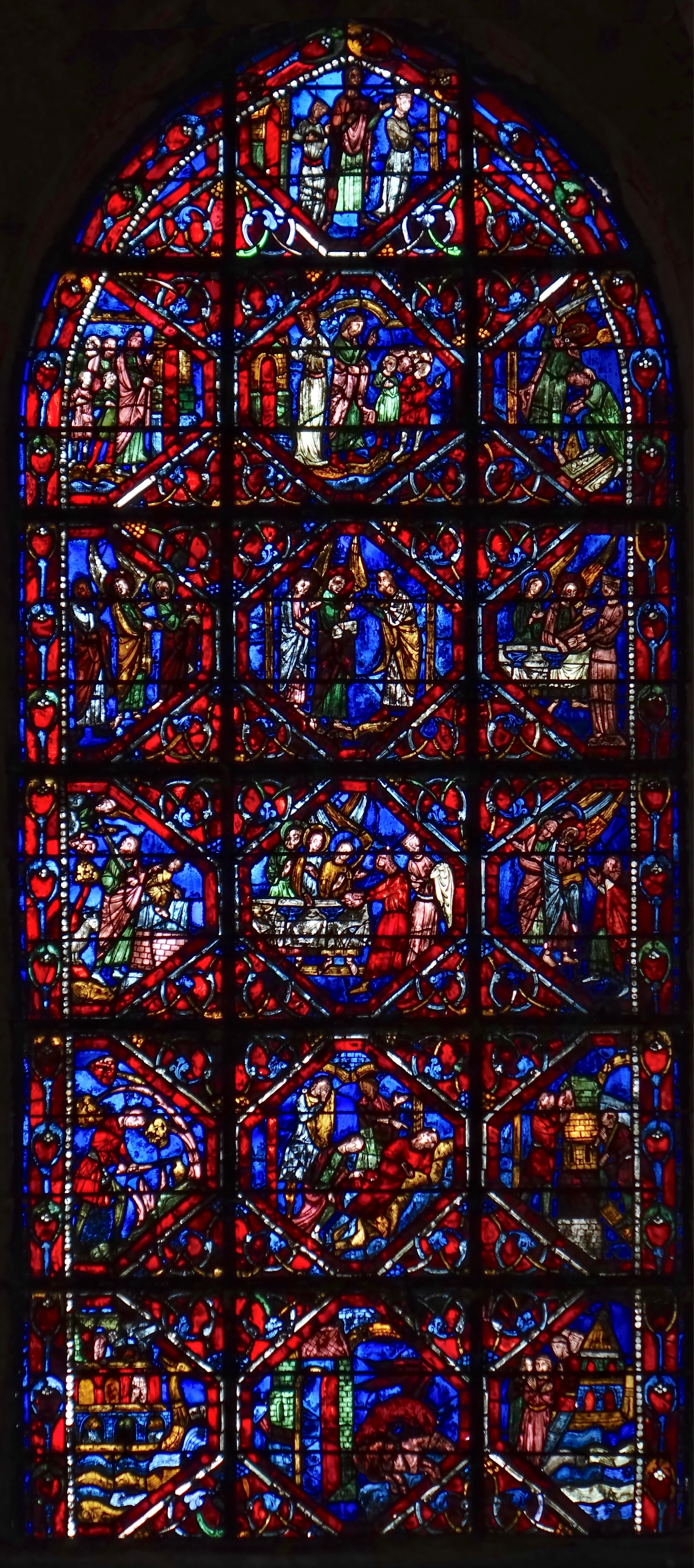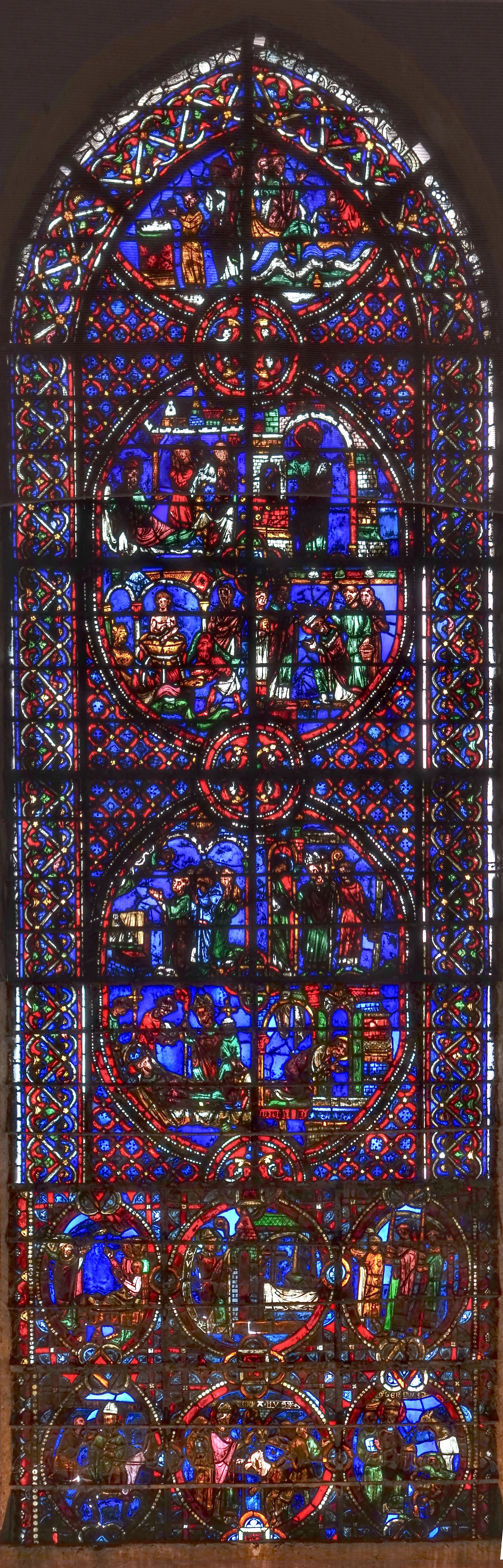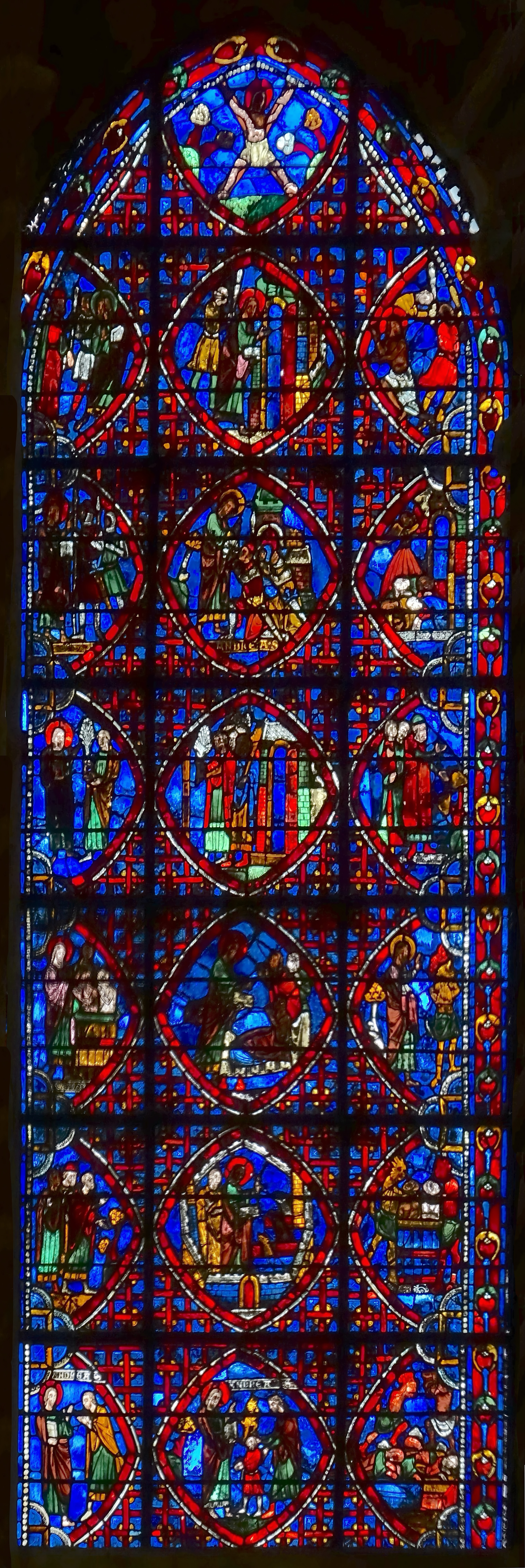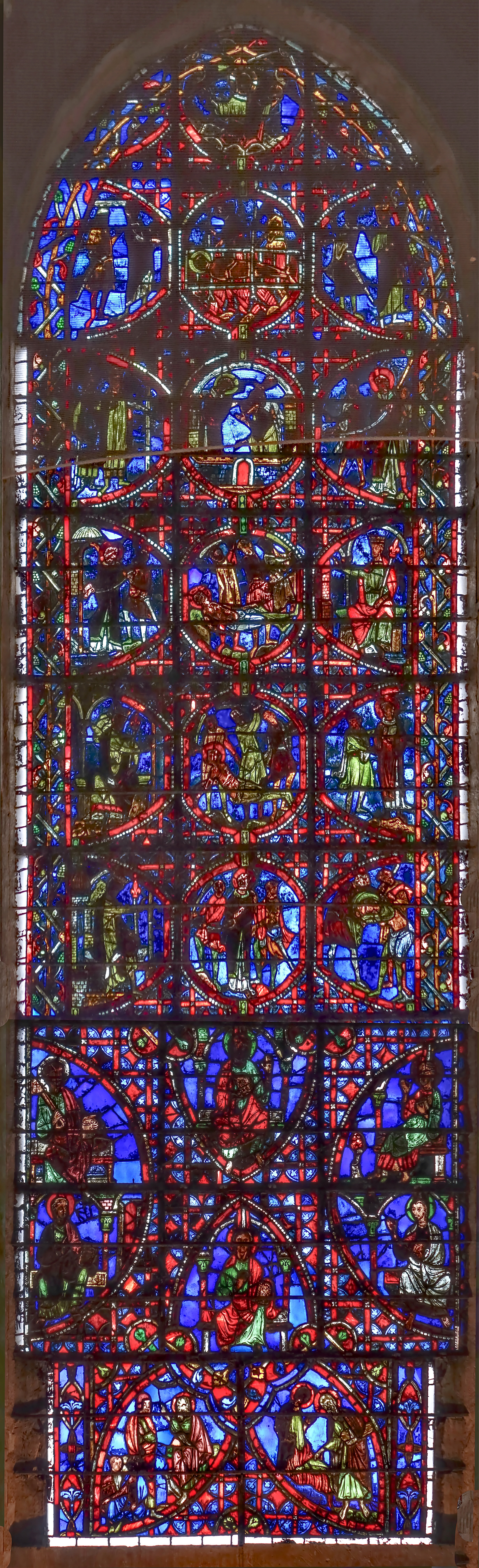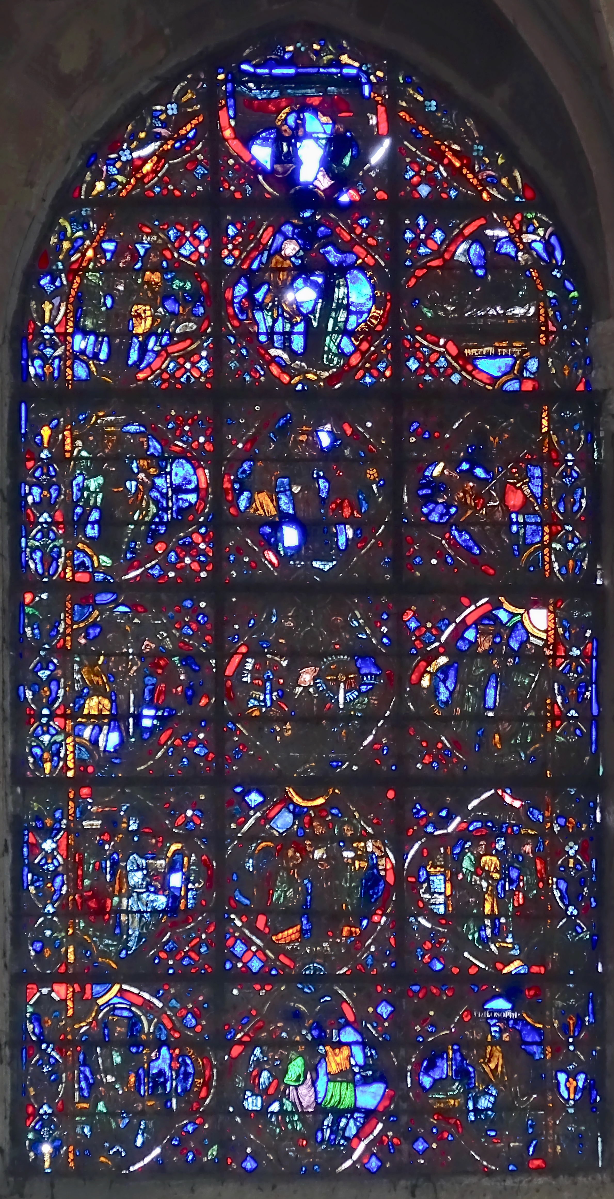 dans une des baies de la chapelle de la Vierge ont été transportés les panneaux d'un vitrail représentant la légende de Théophile.