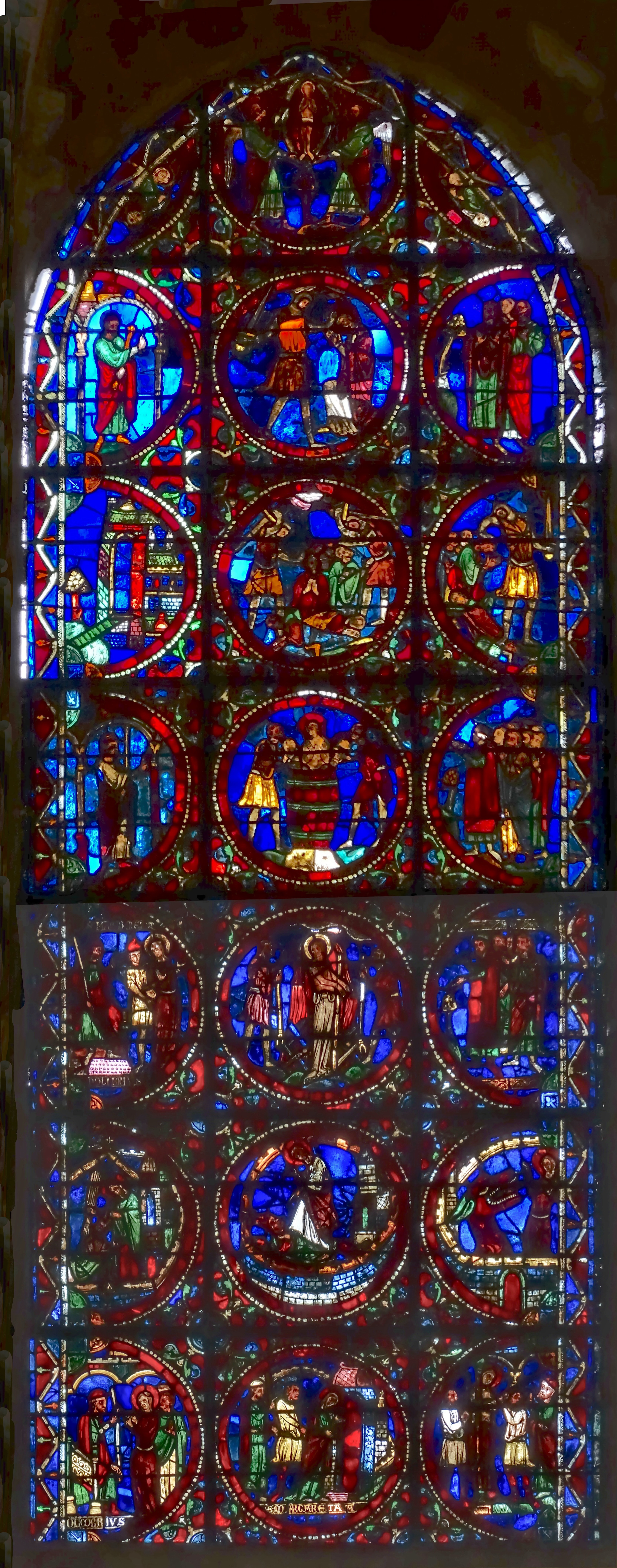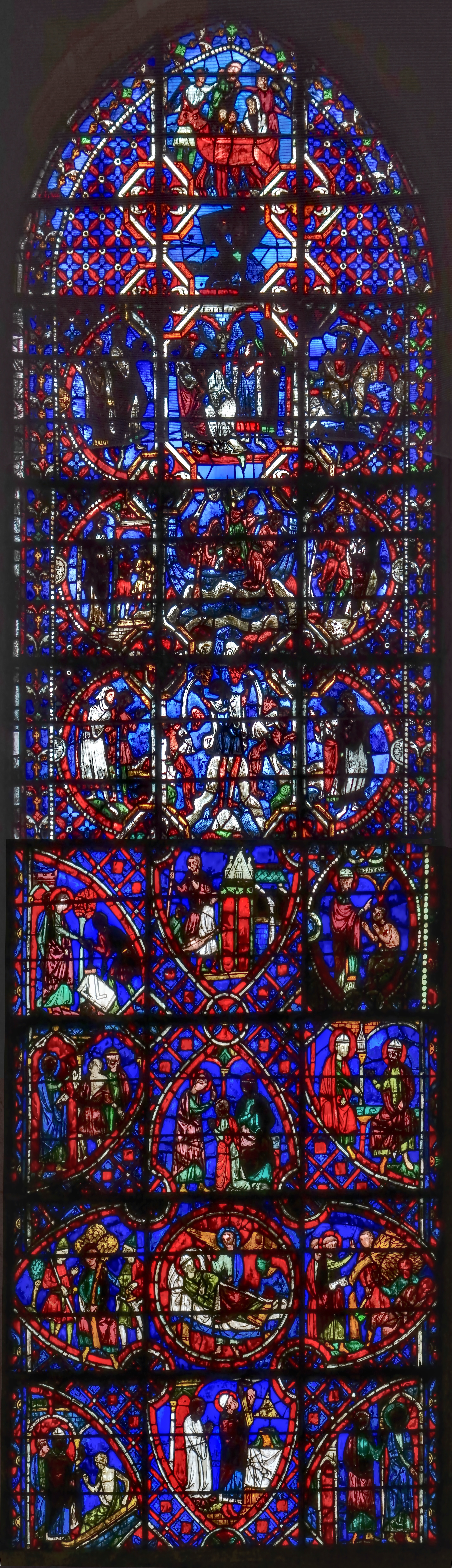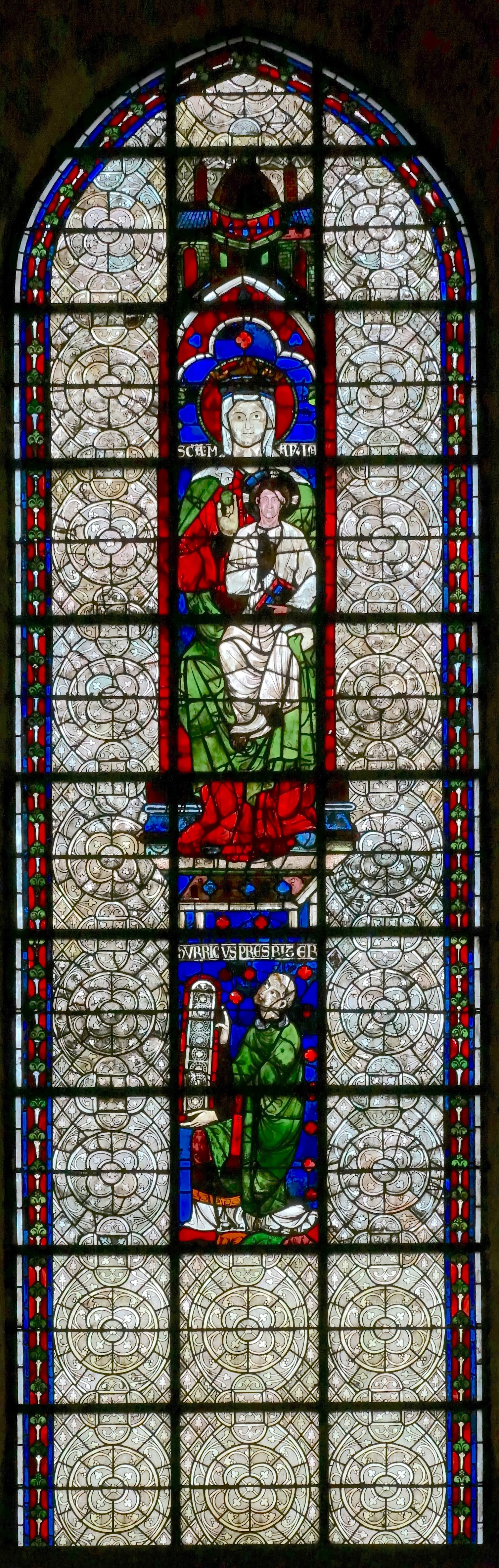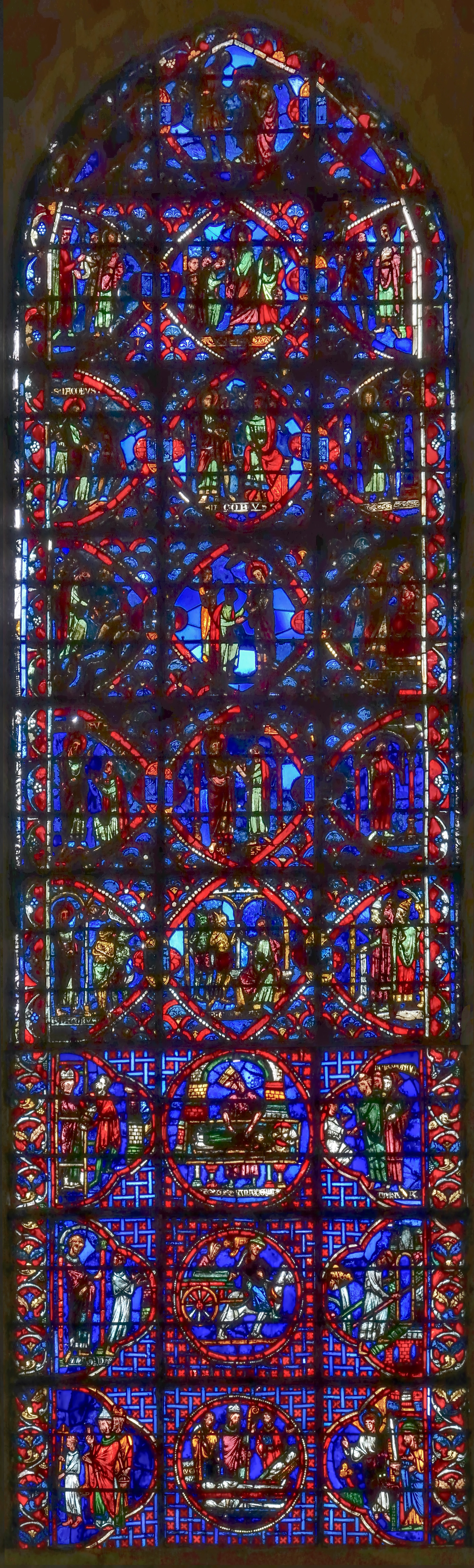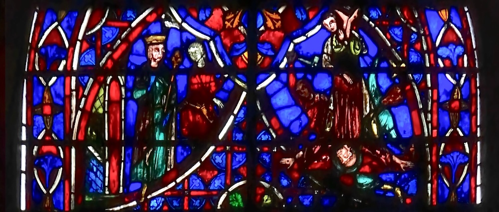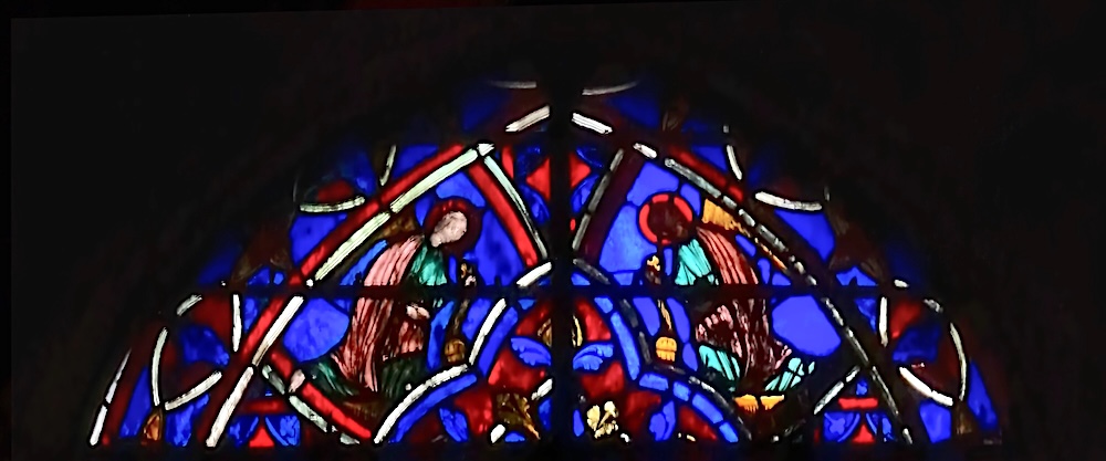 dans une des baies de la chapelle de la Vierge ont été transportés les panneaux d'un vitrail représentant la légende de Théophile.