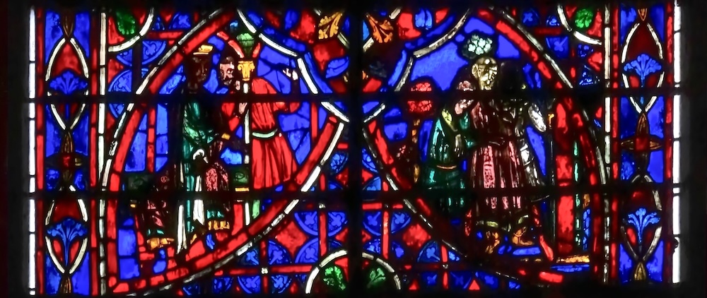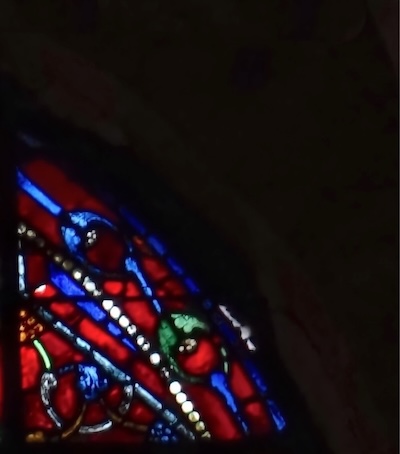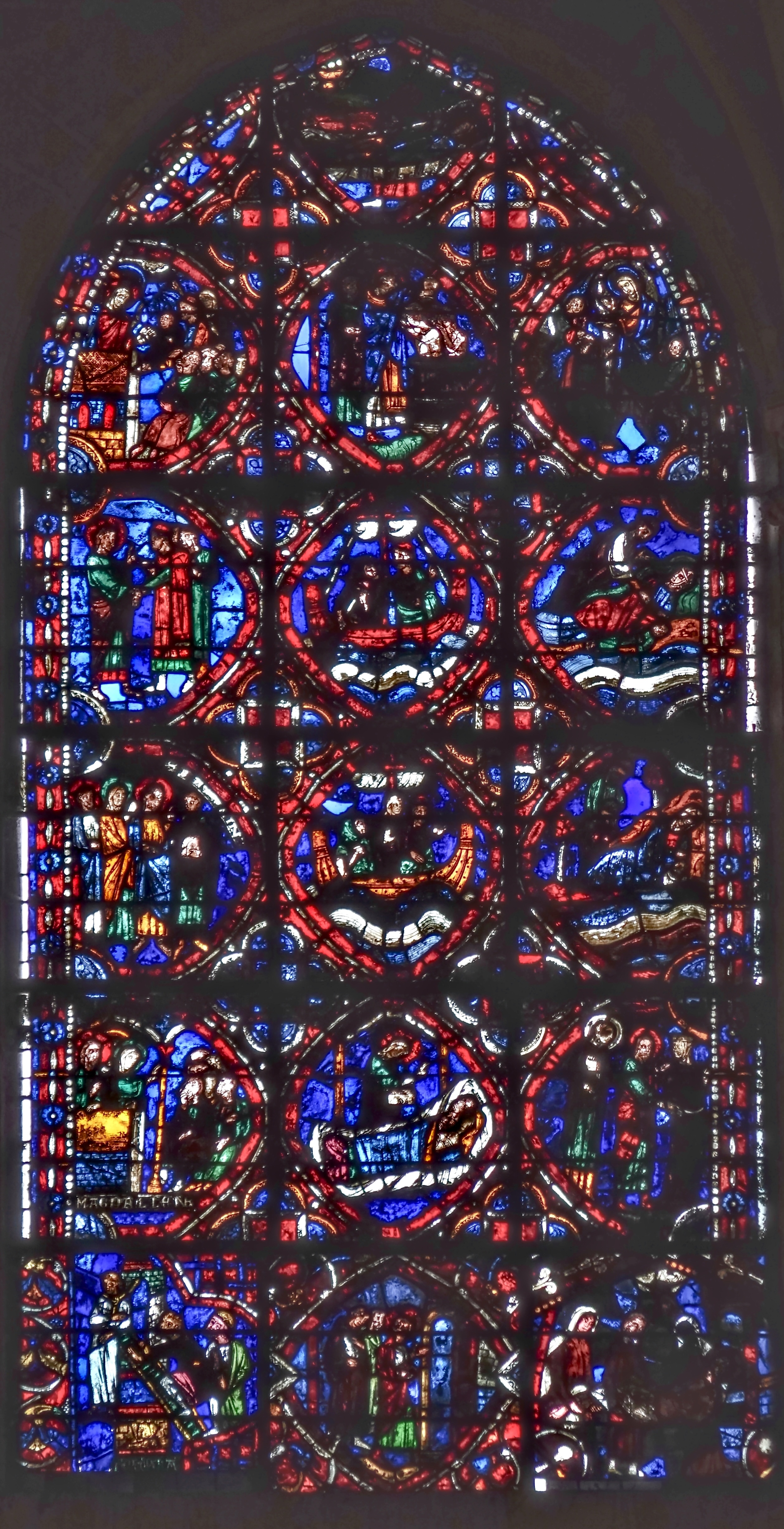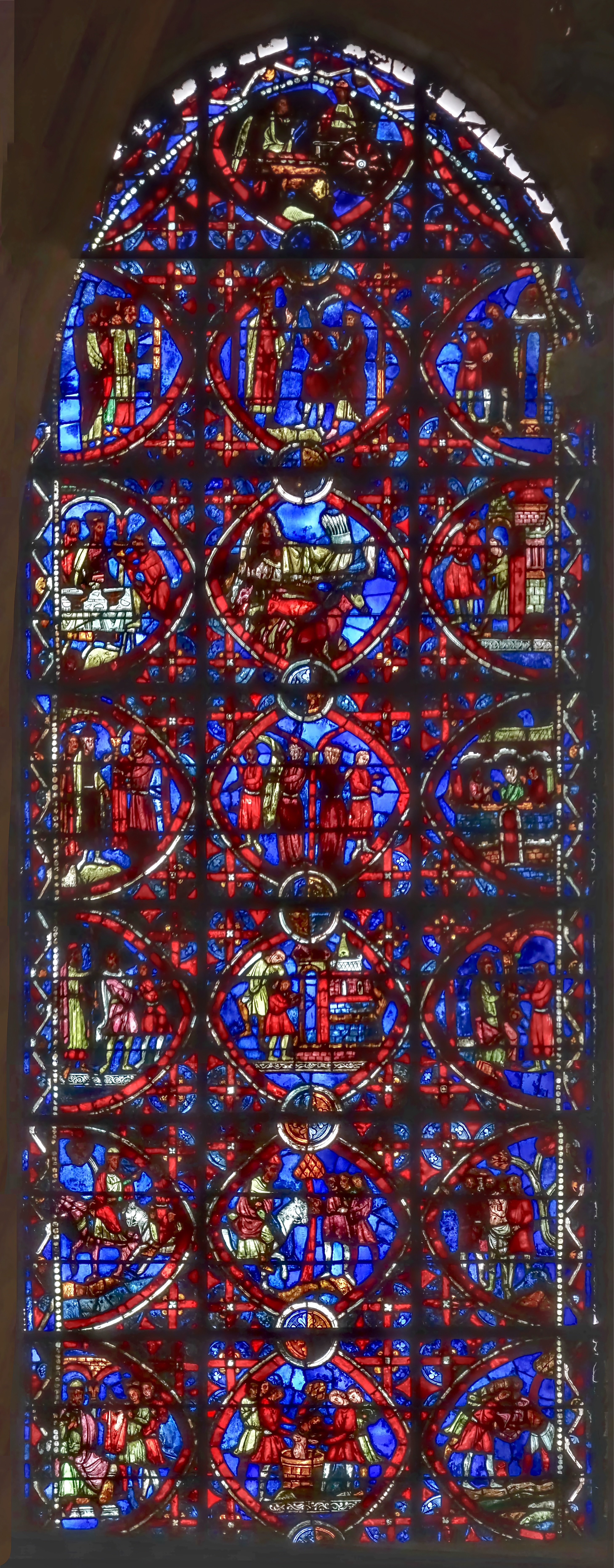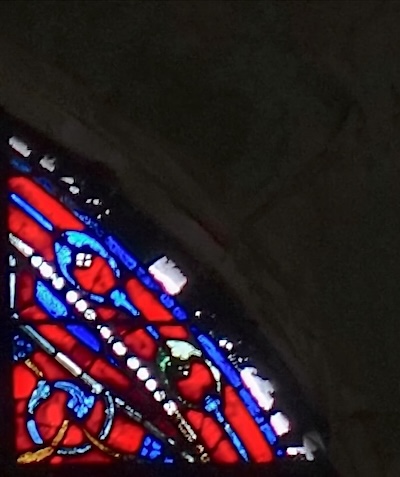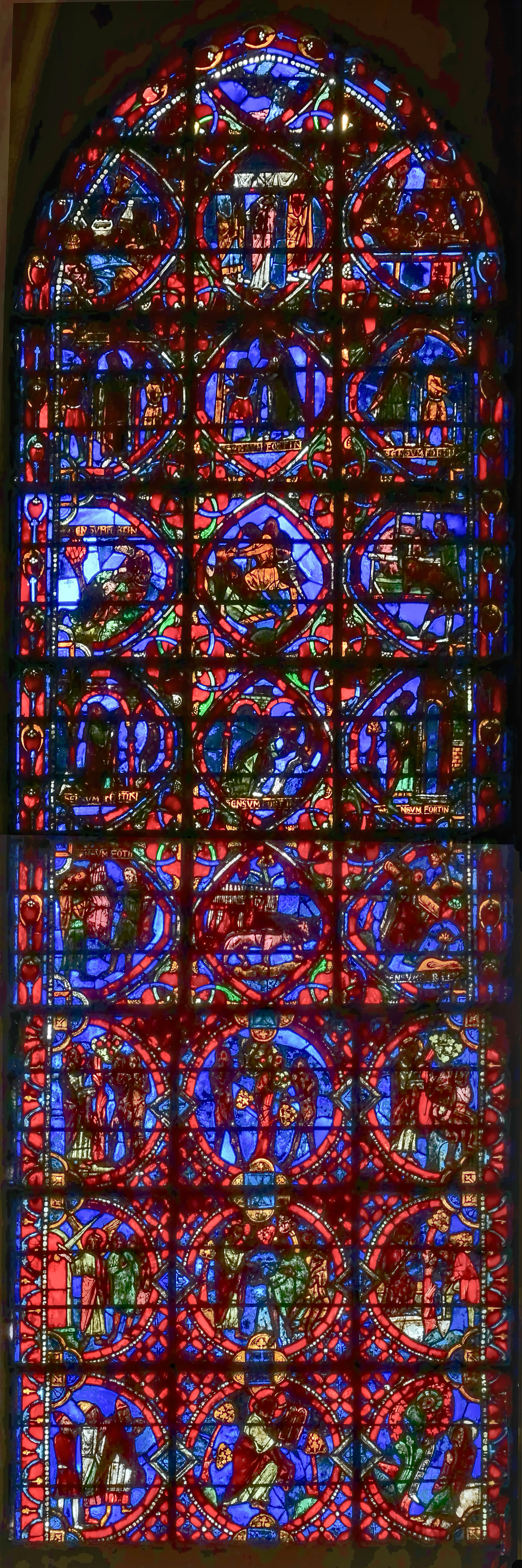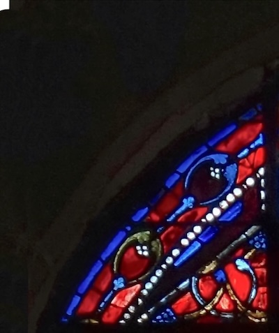 dans une des baies de la chapelle de la Vierge ont été transportés les panneaux d'un vitrail représentant la légende de Théophile.