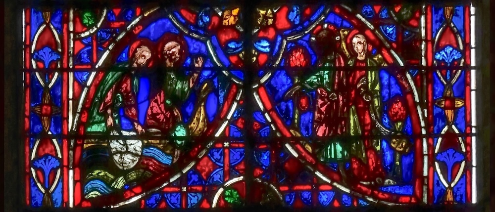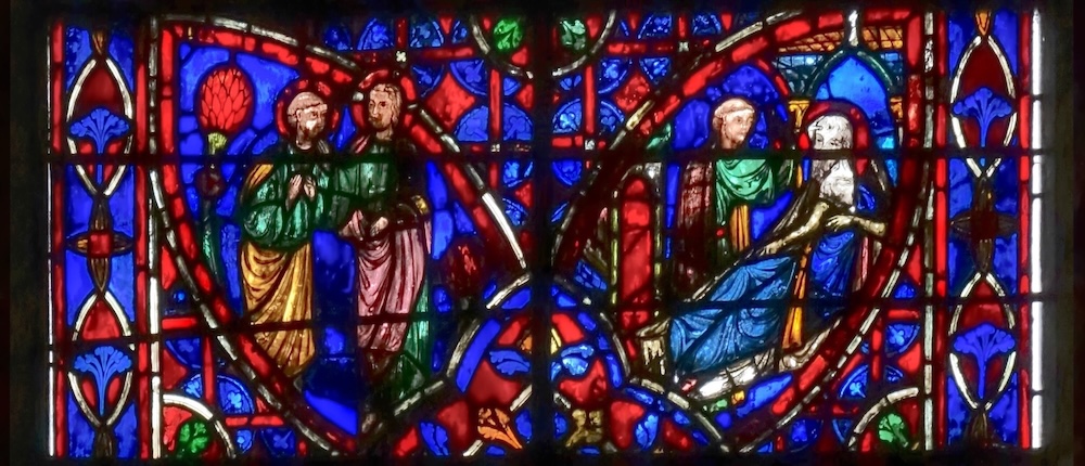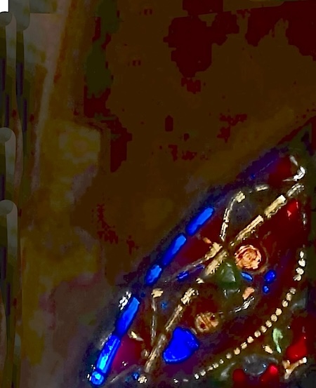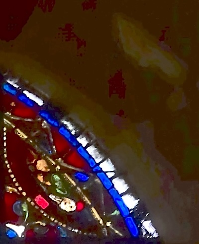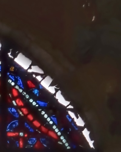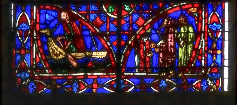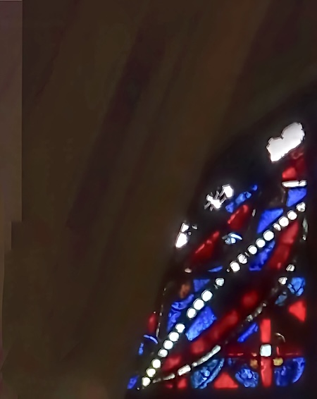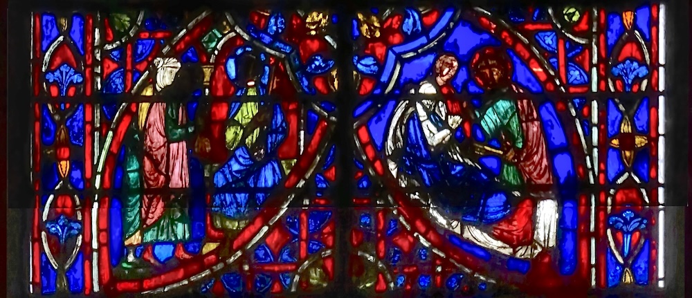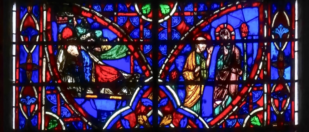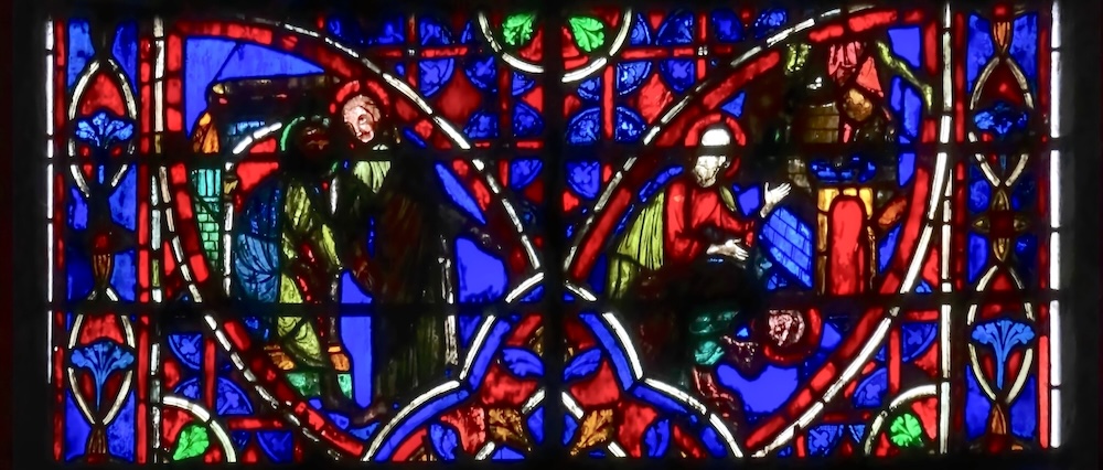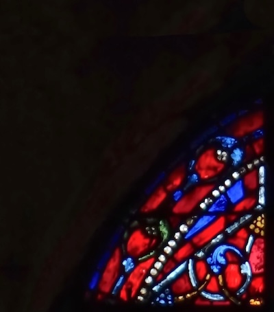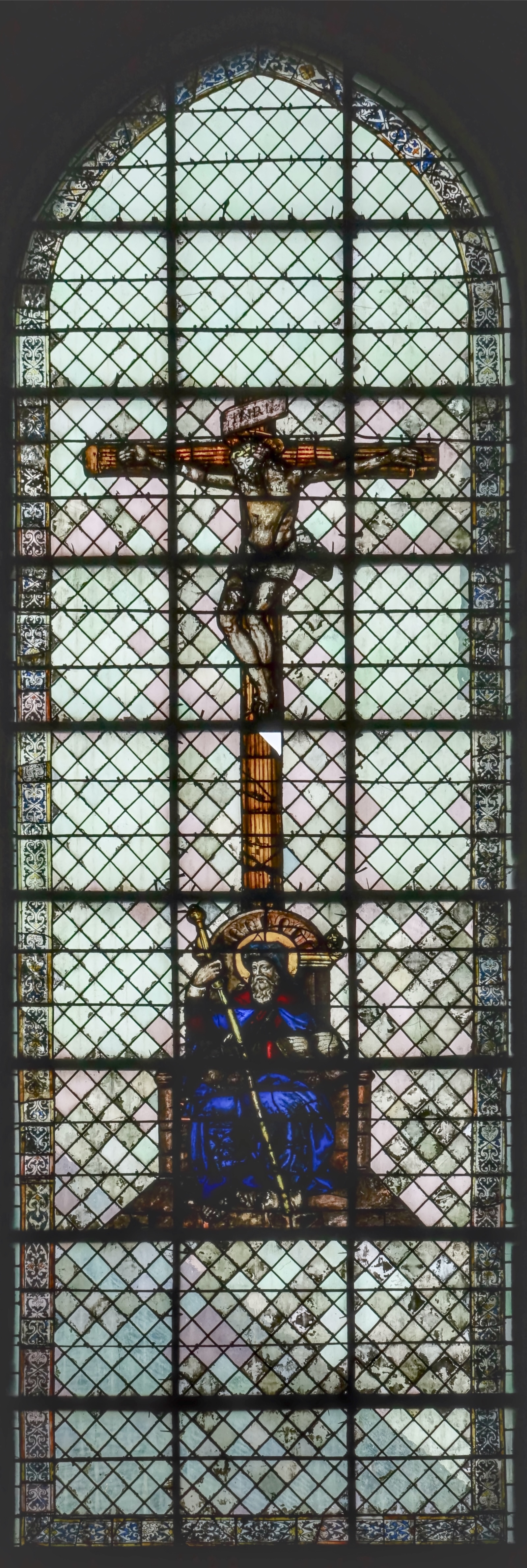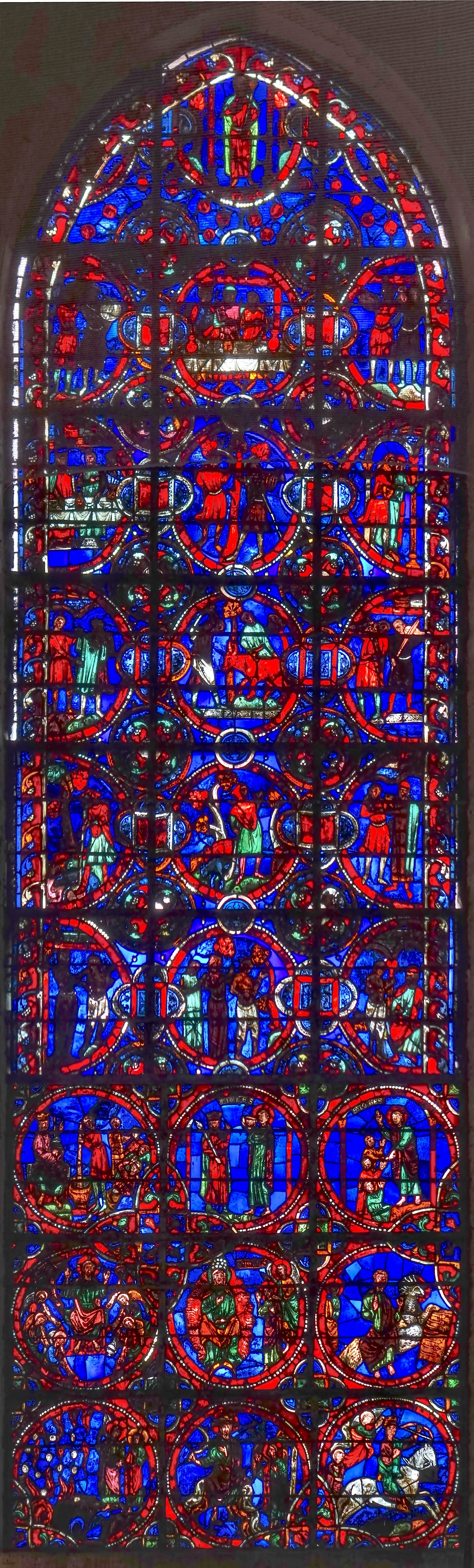 dans une des baies de la chapelle de la Vierge ont été transportés les panneaux d'un vitrail représentant la légende de Théophile.