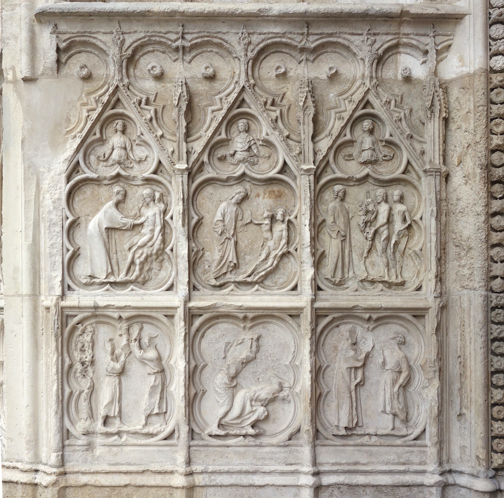 La partie inférieure des soubassements est sculptée de bas-reliefs sous forme de médaillons, chefs-d'œuvre de la sculpture du Moyen Âge (13e siècle). On y trouve illustrant la Genèse (Création du monde) et l'arche de Noé, symbole du salut.
