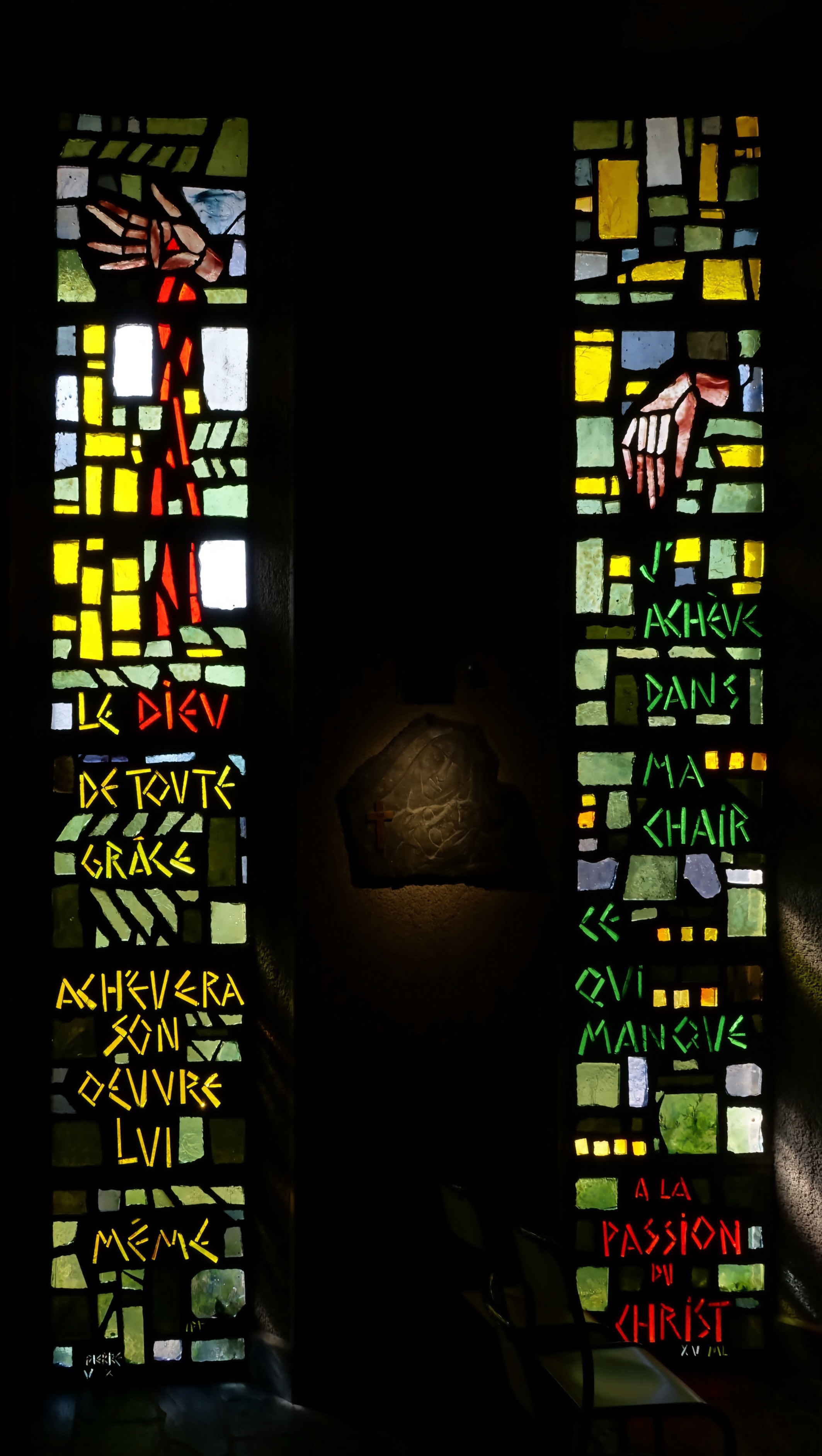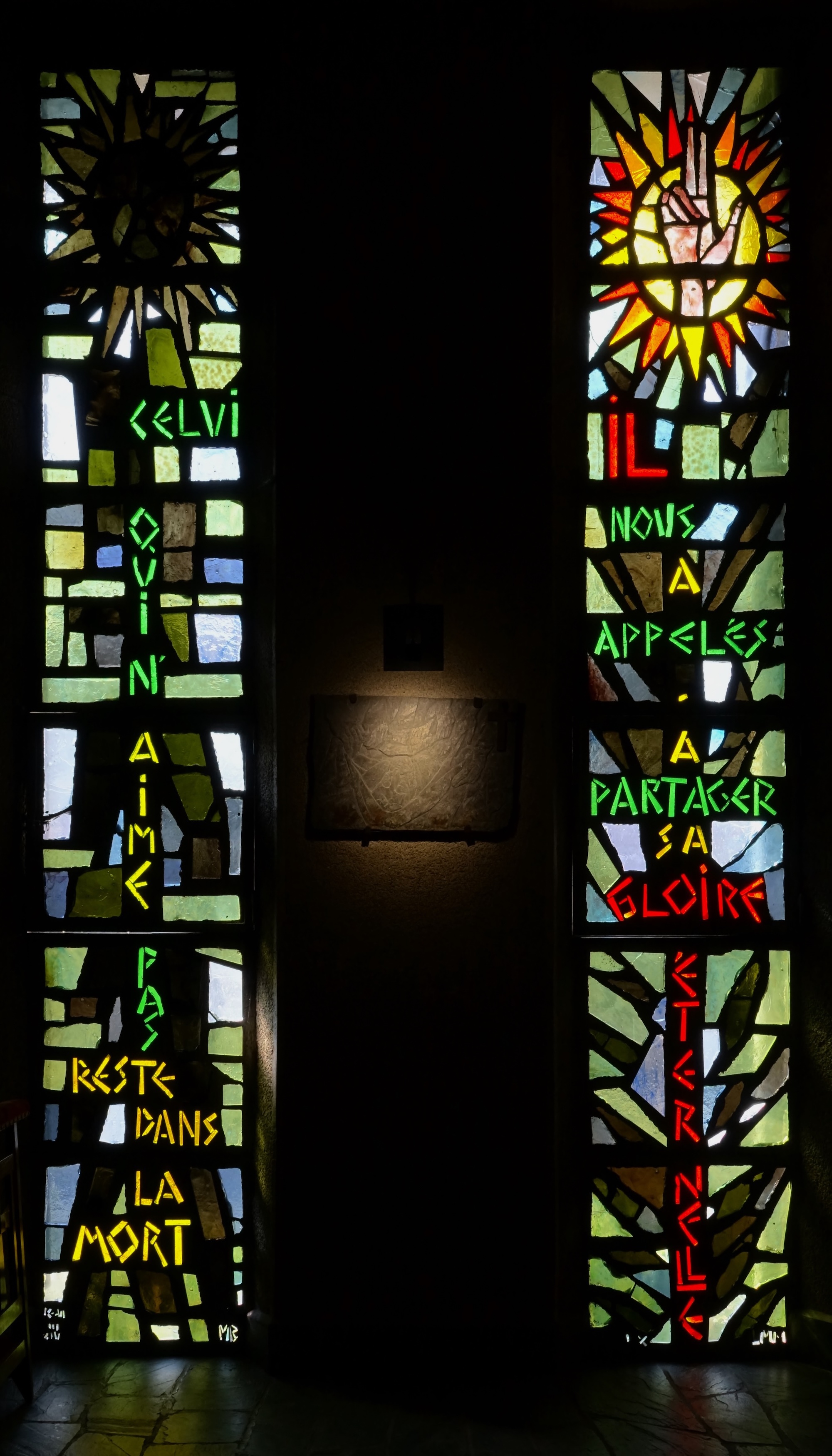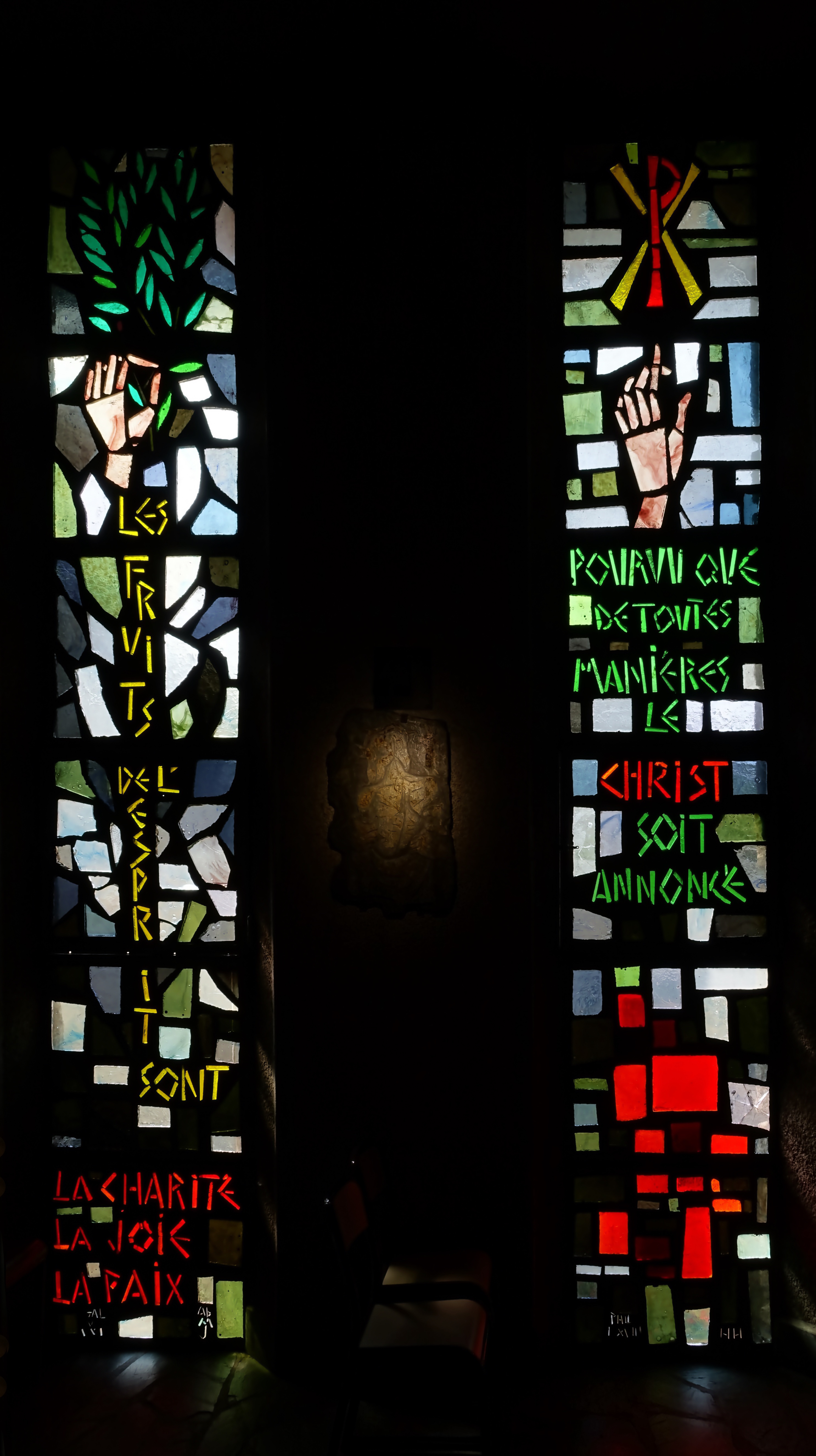 Le mur pignon est scandé en partie haute par des grandes verrières en dalles de verres dans un réseau de ciment, réalisées par Jacques et Mireille Juteau. Ceux-ci réalisent le même type de vitraux, évoquant les versets du Nouveau Testament, dans des baies verticales sur le mur sud de la nef.