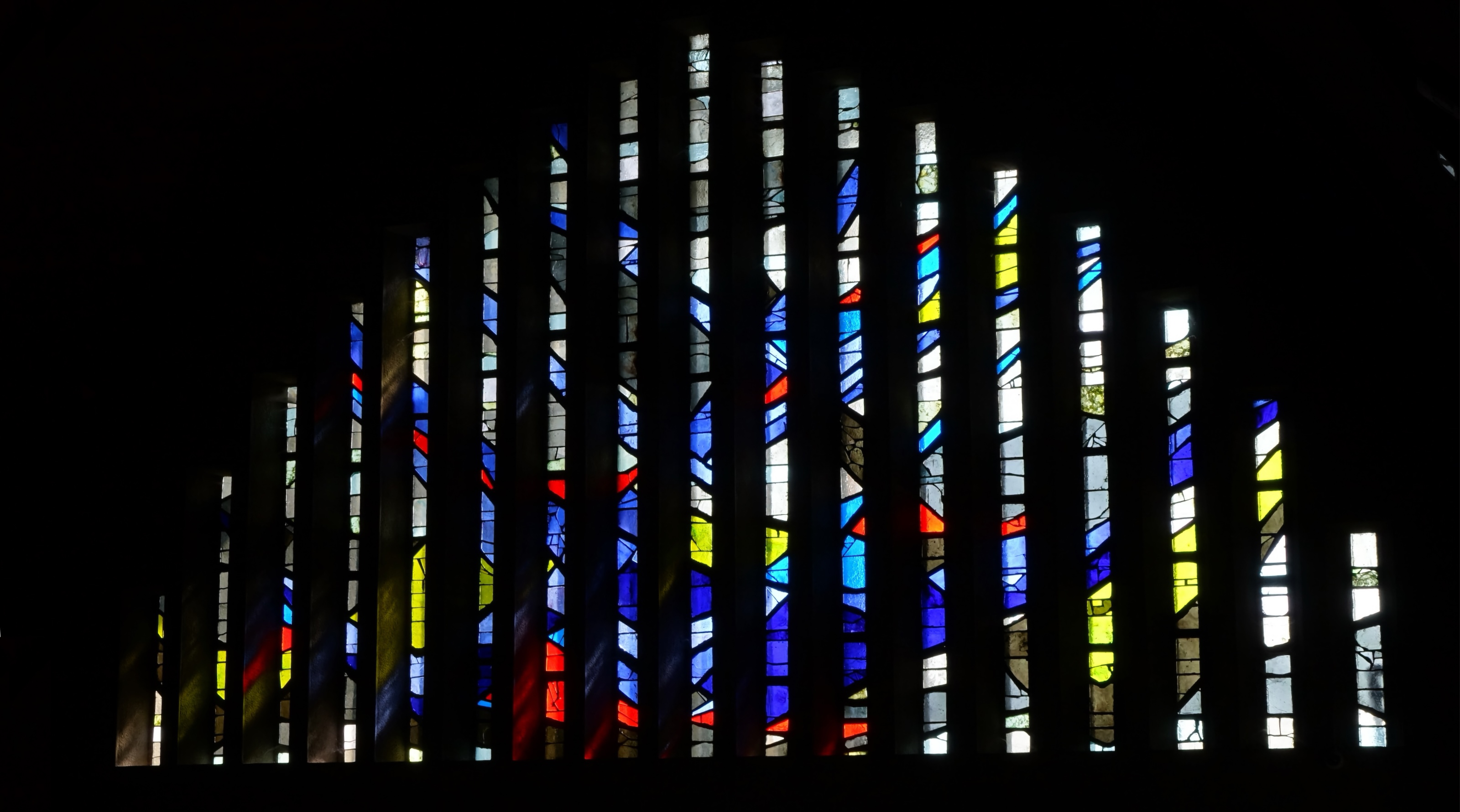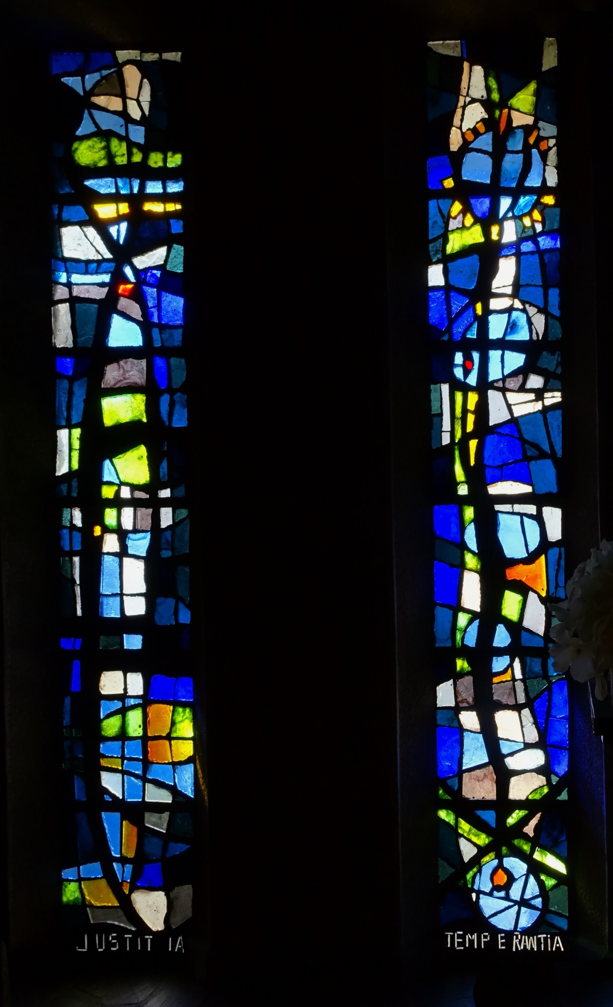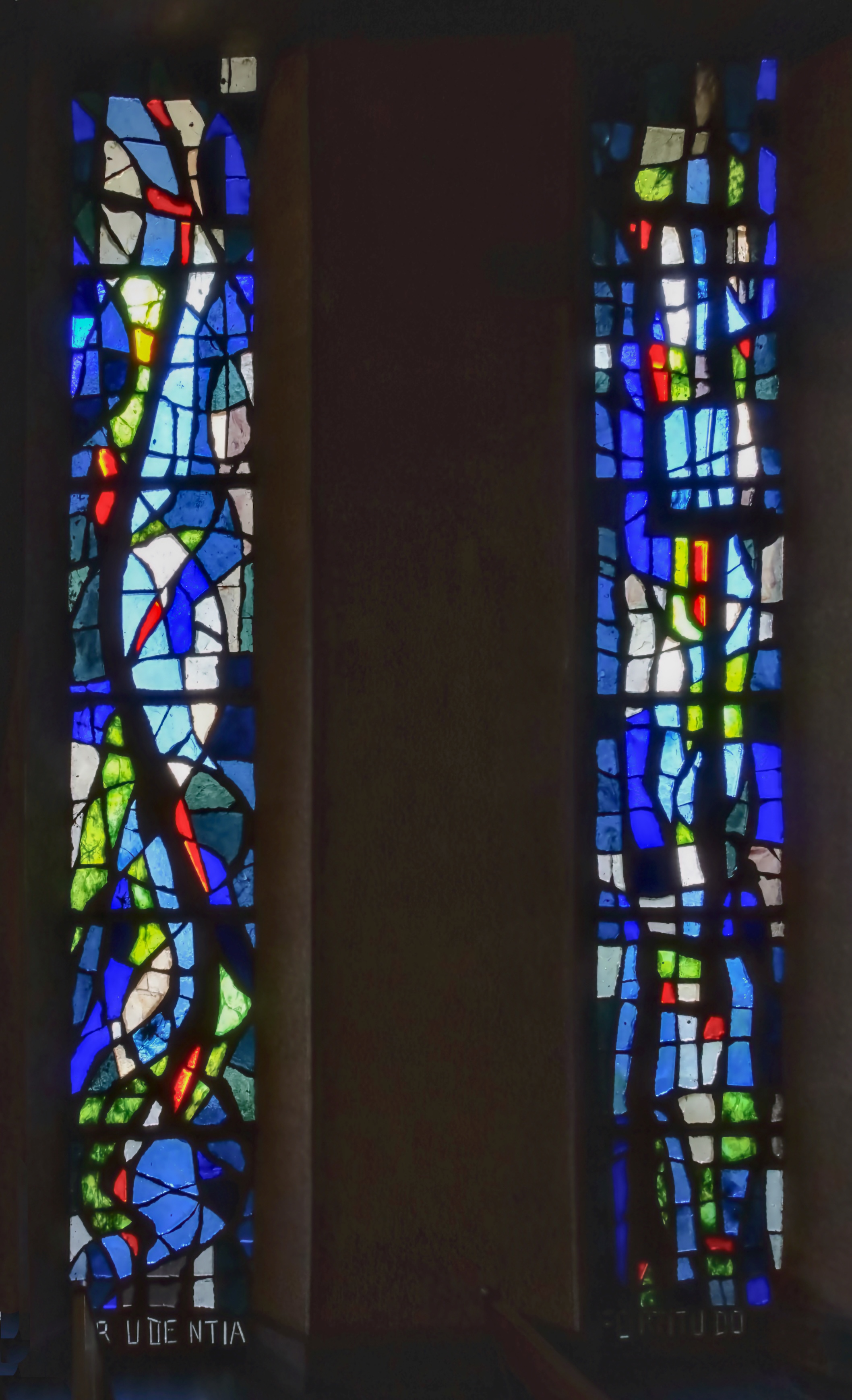 Le mur pignon est scandé en partie haute par des grandes verrières en dalles de verres dans un réseau de ciment, réalisées par Jacques et Mireille Juteau. Ceux-ci réalisent le même type de vitraux, évoquant les versets du Nouveau Testament, dans des baies verticales sur le mur sud de la nef.