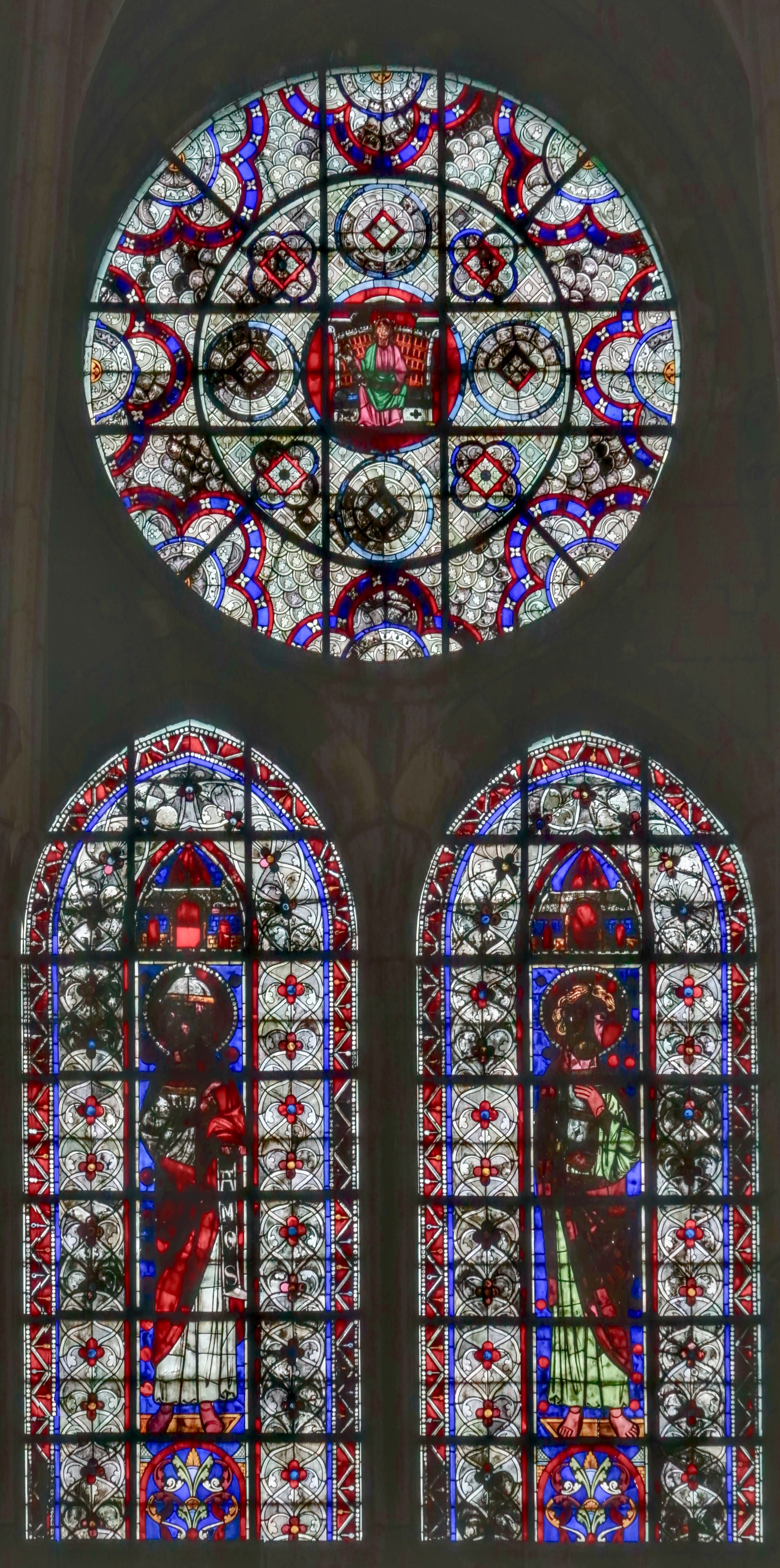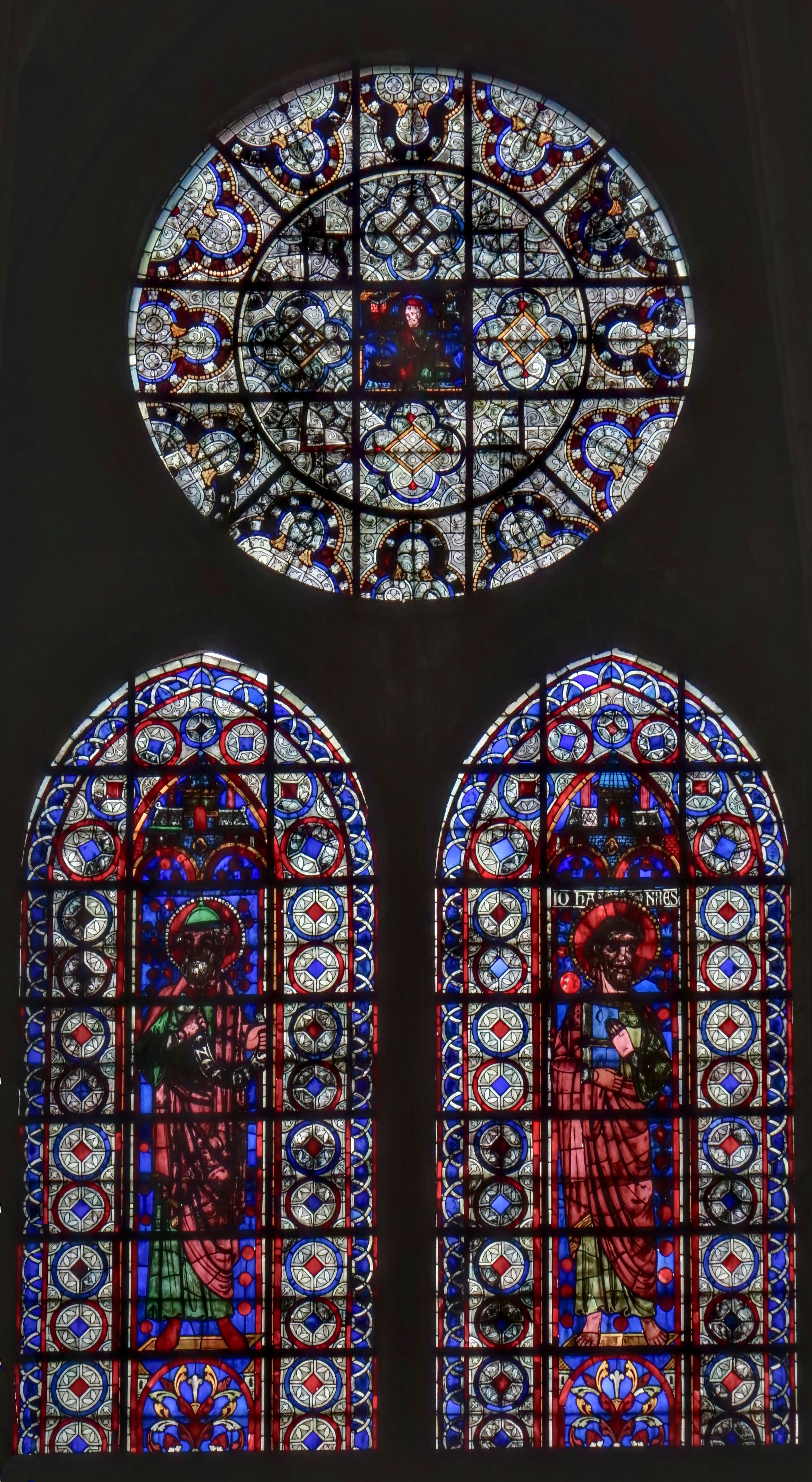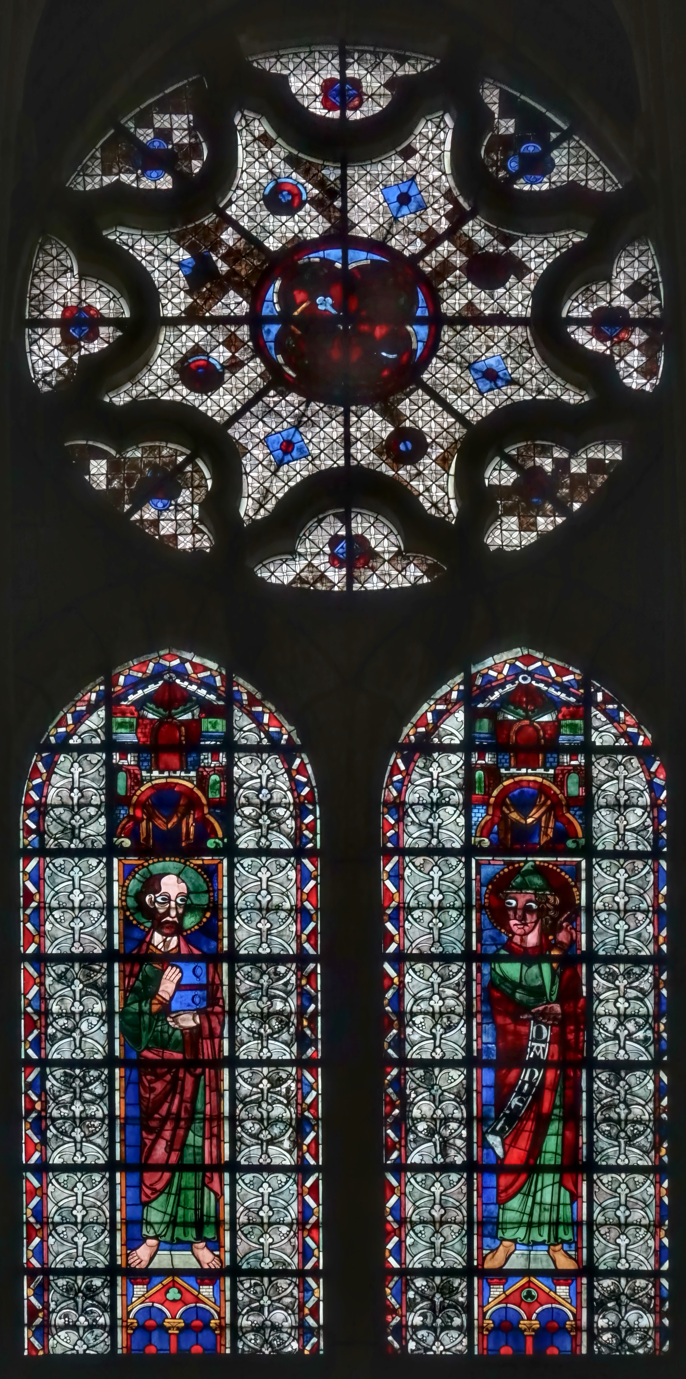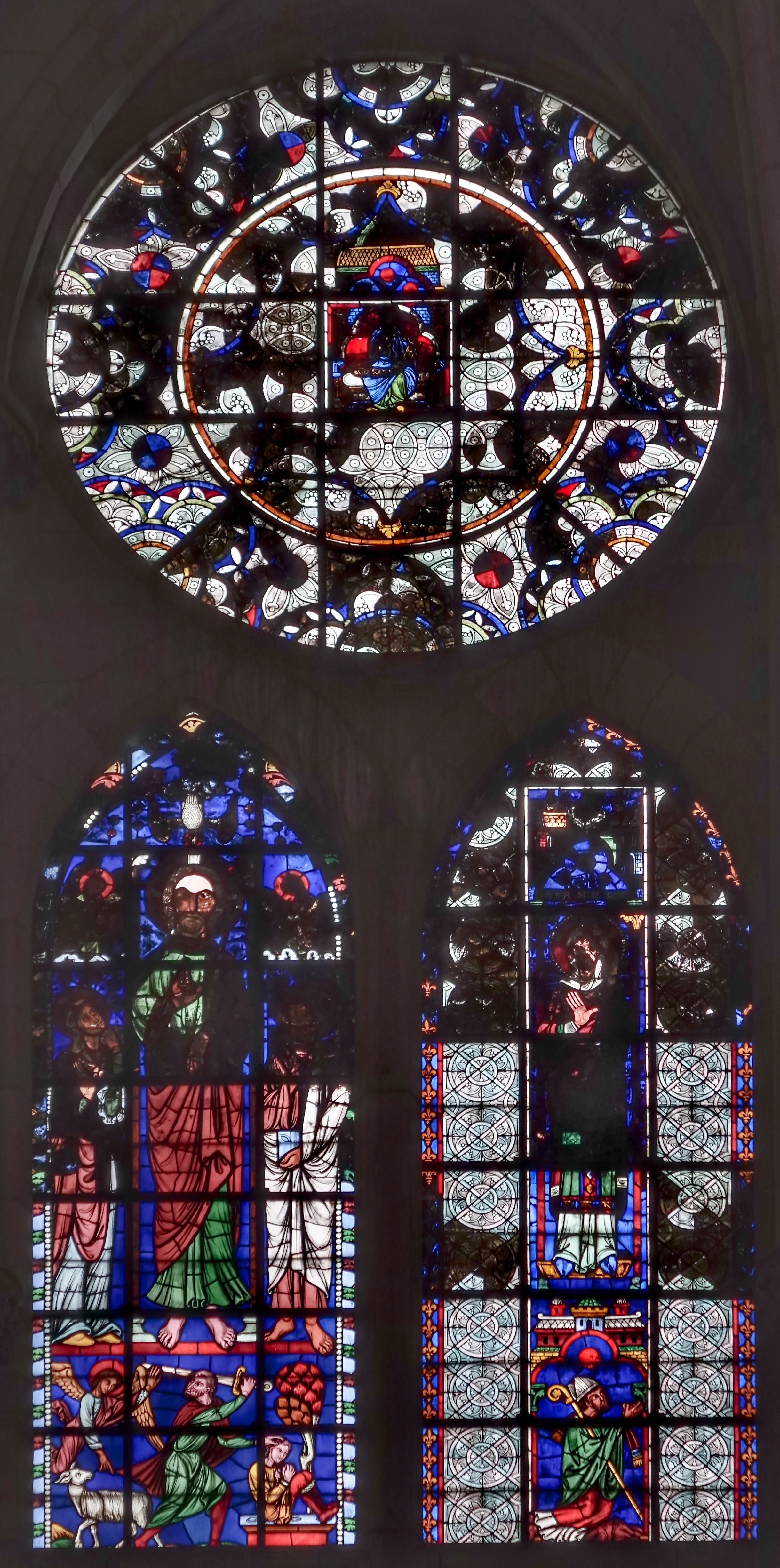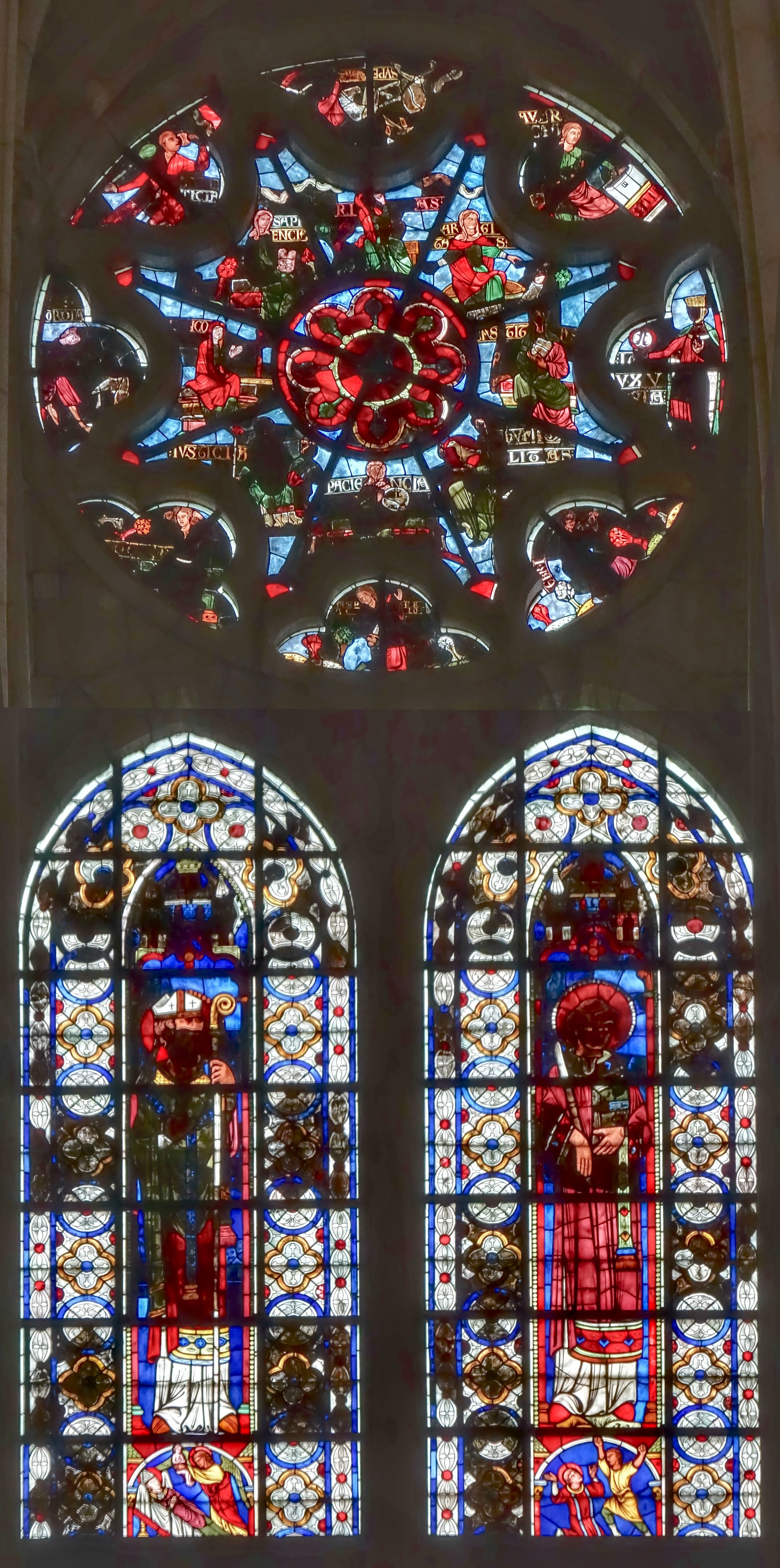Les hautes baies du chœur renferment des vitraux du 13e siècle. On y voit des apôtres, des prophètes, des saints, et, dans les rosaces des deux baies voisines de la baie centrale, la représentation, à gauche, des Vertus et des Vices, à droite, des Arts libéraux.