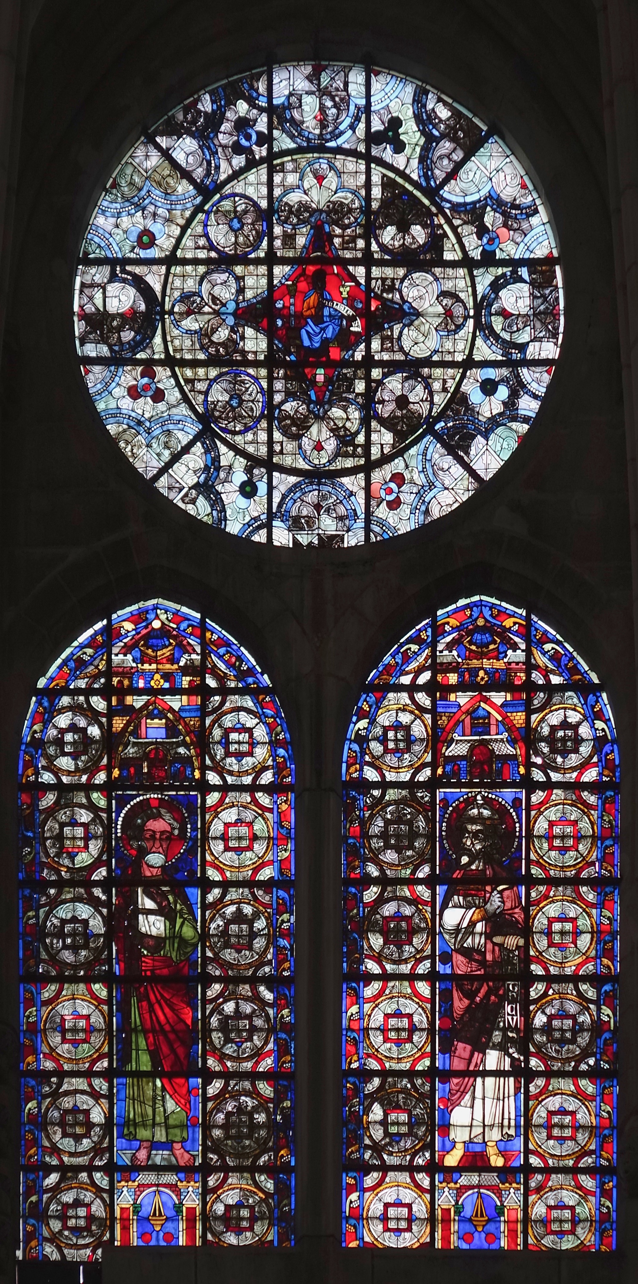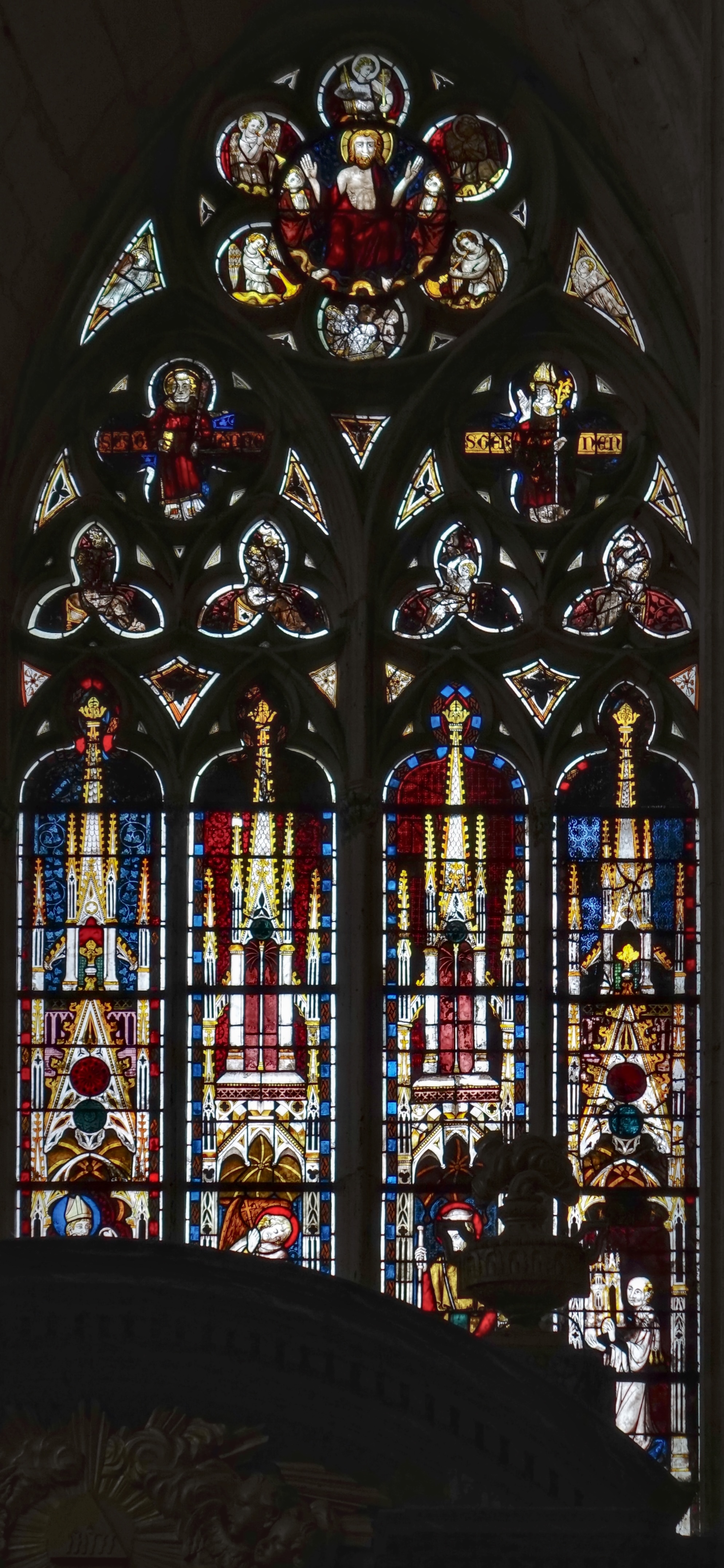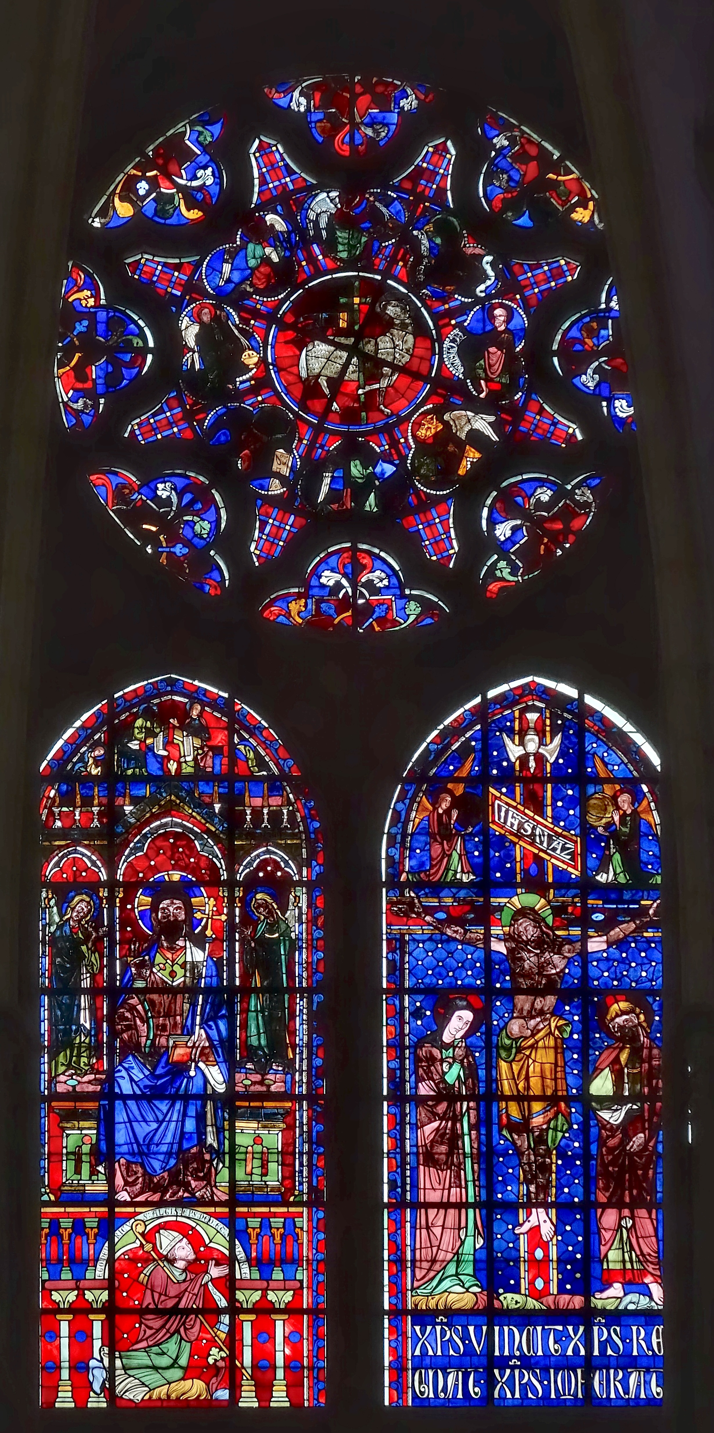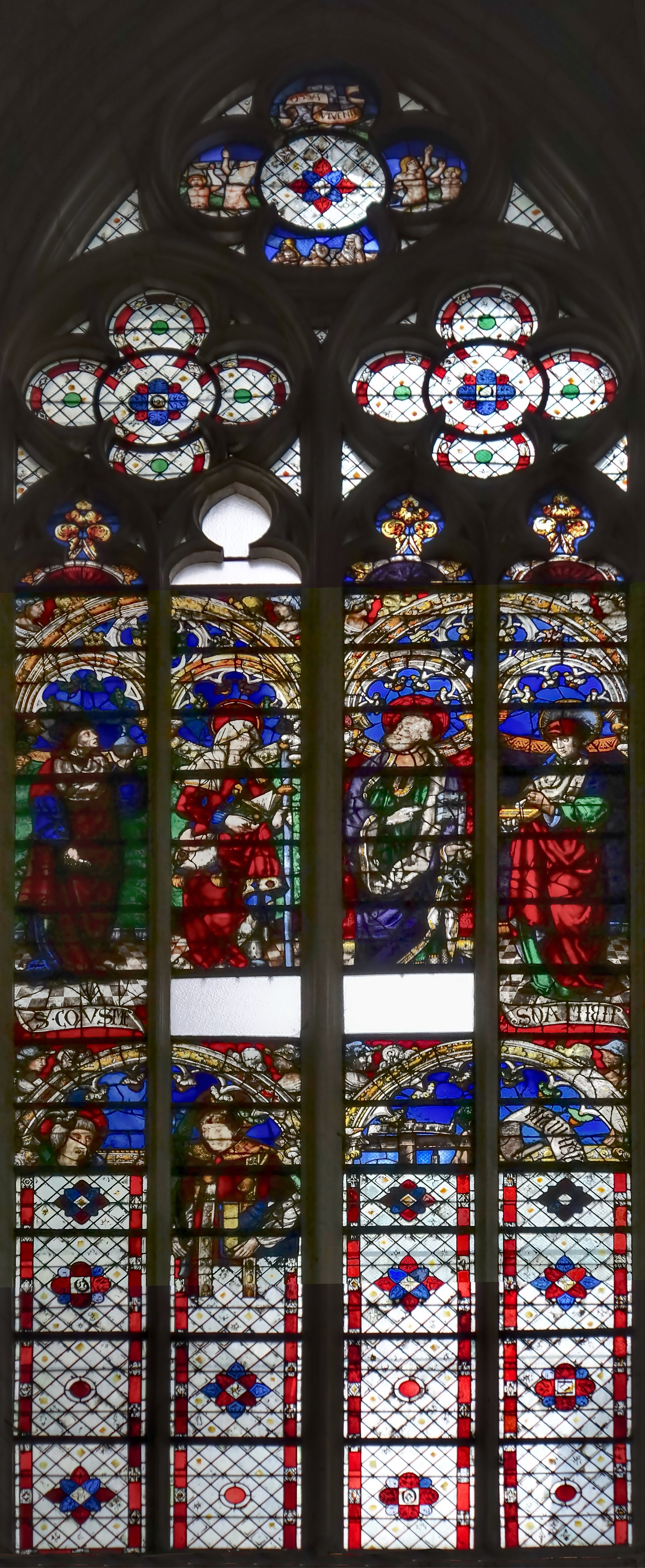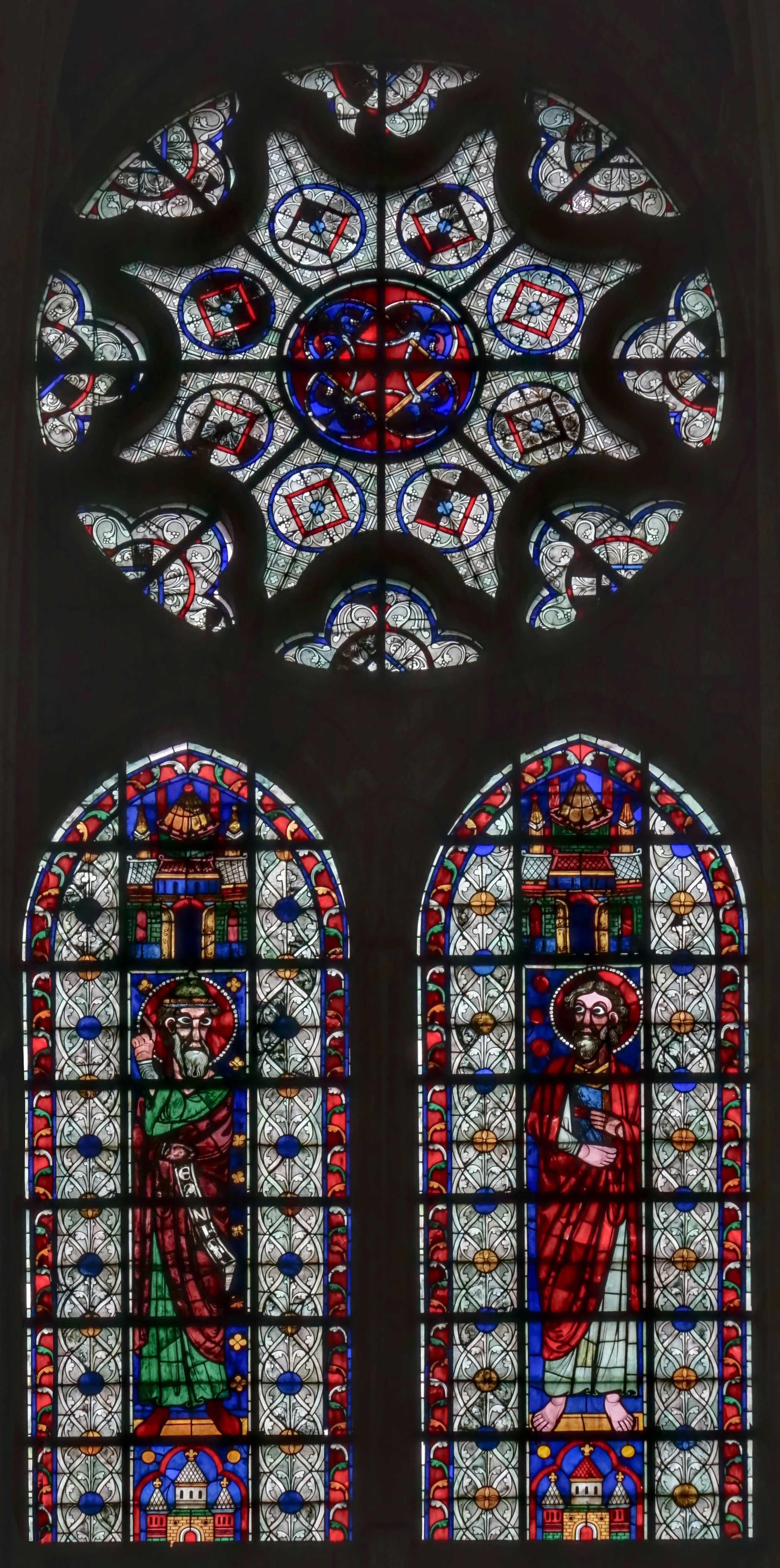Les hautes baies du chœur renferment des vitraux du 13e siècle. On y voit des apôtres, des prophètes, des saints, et, dans les rosaces des deux baies voisines de la baie centrale, la représentation, à gauche, des Vertus et des Vices, à droite, des Arts libéraux.