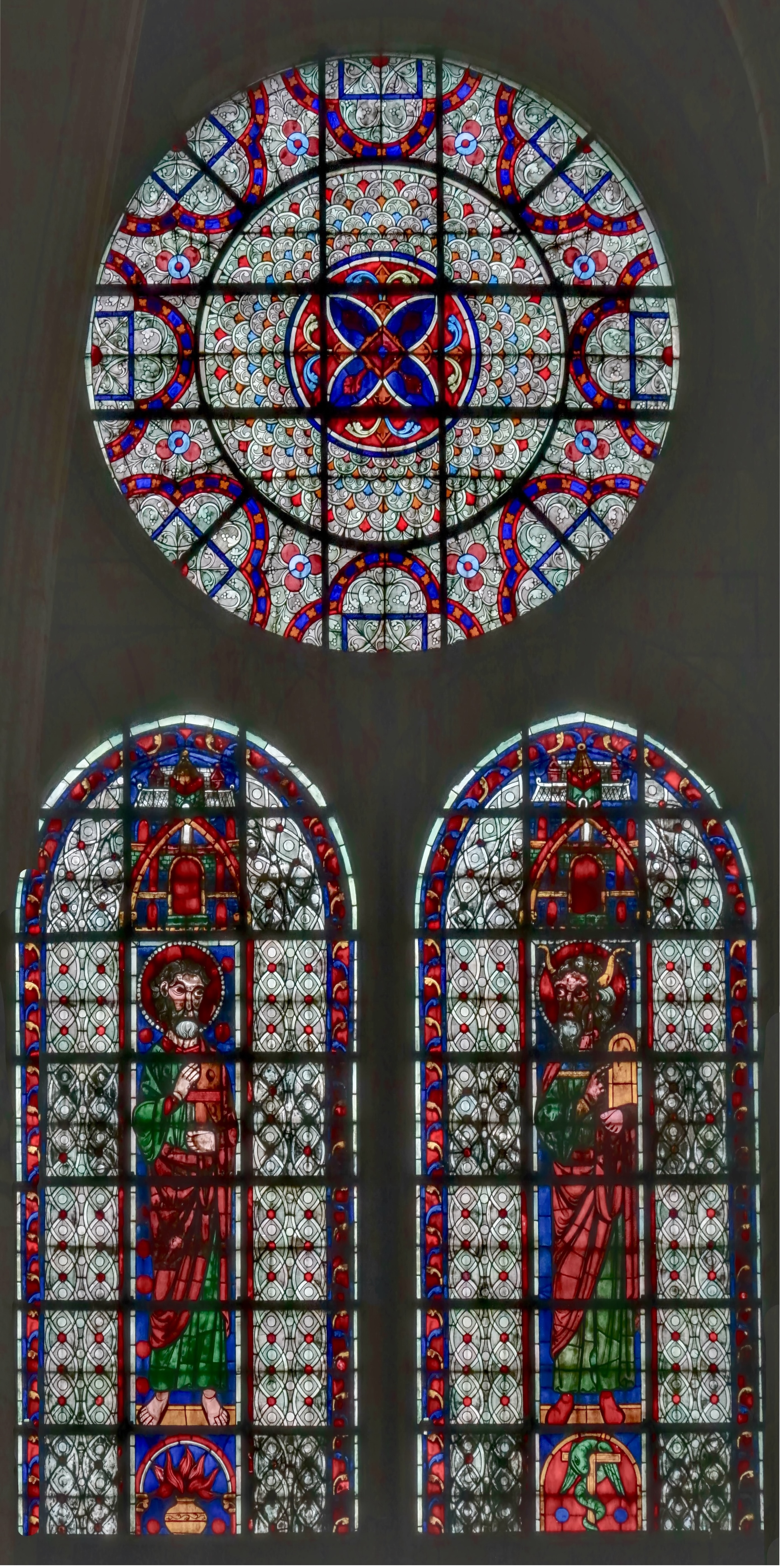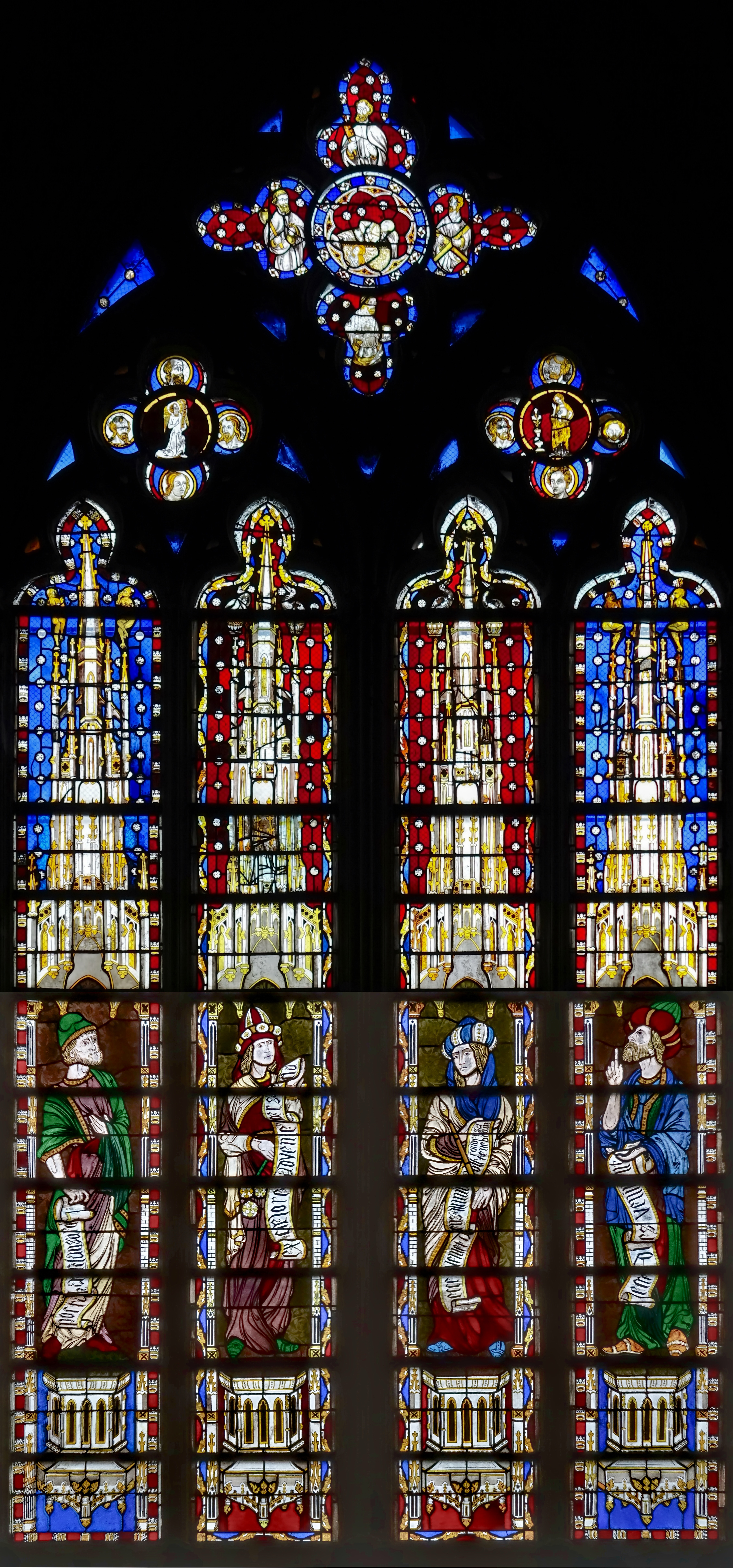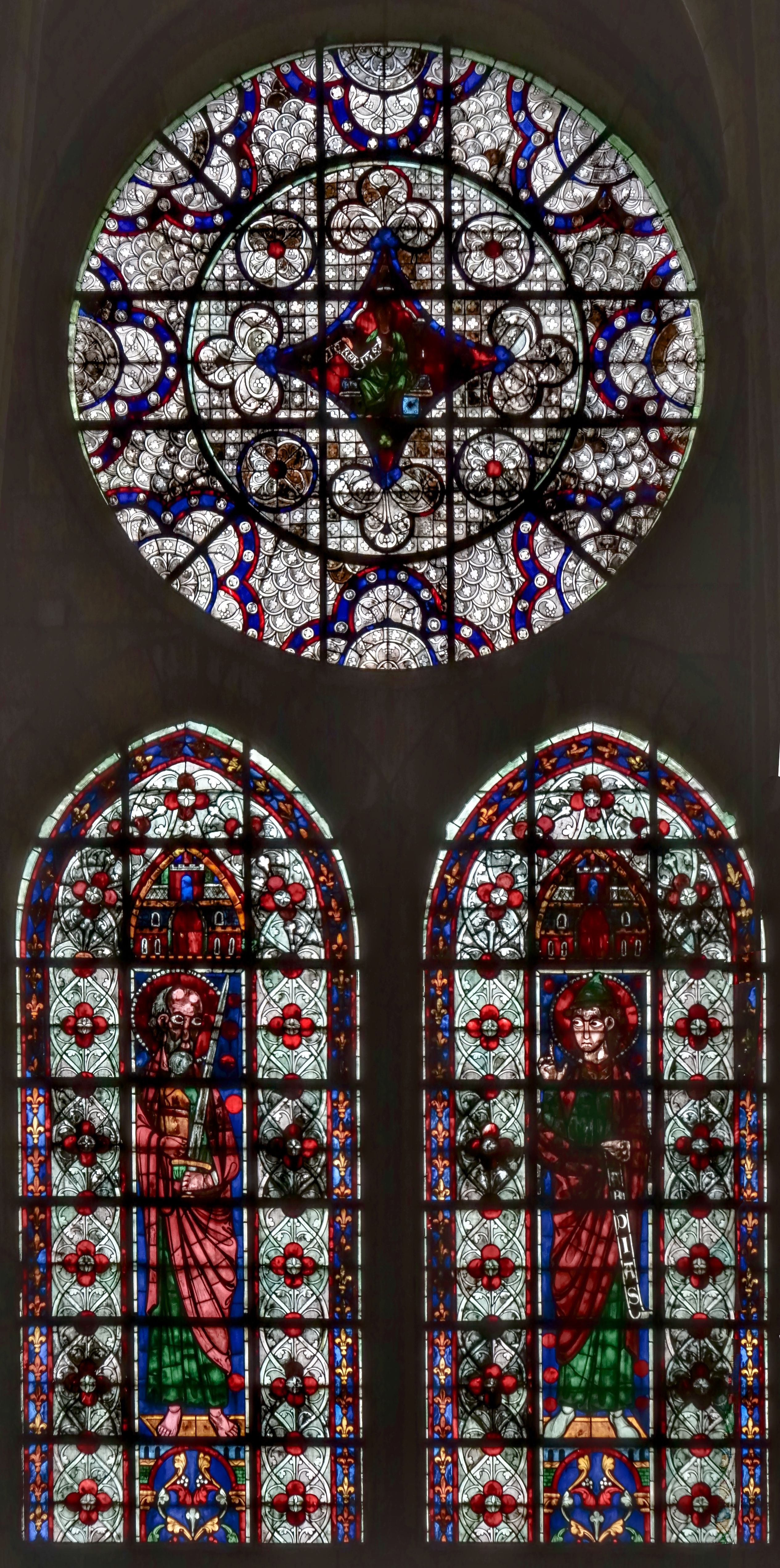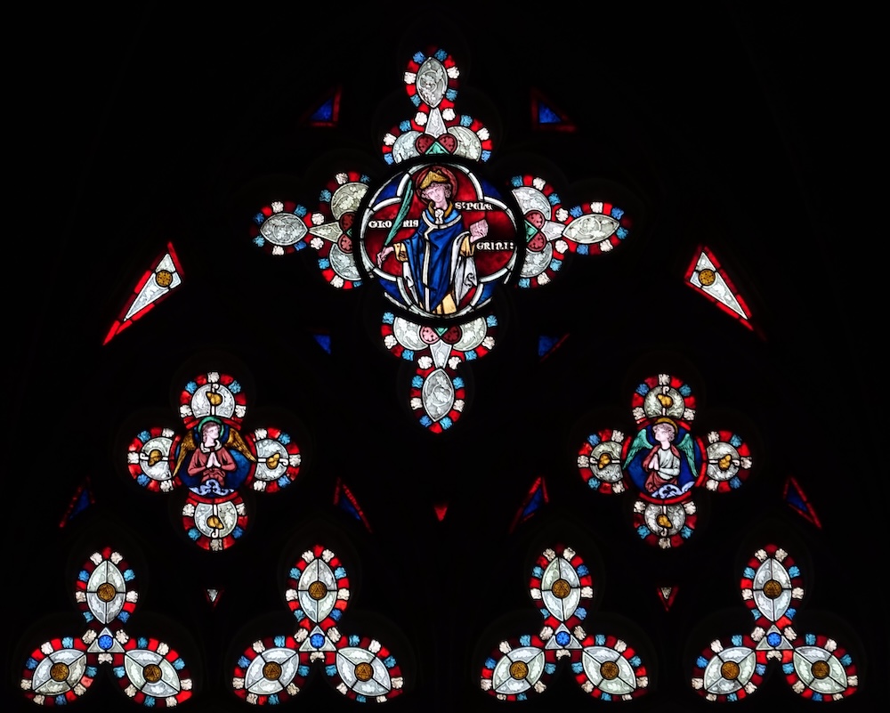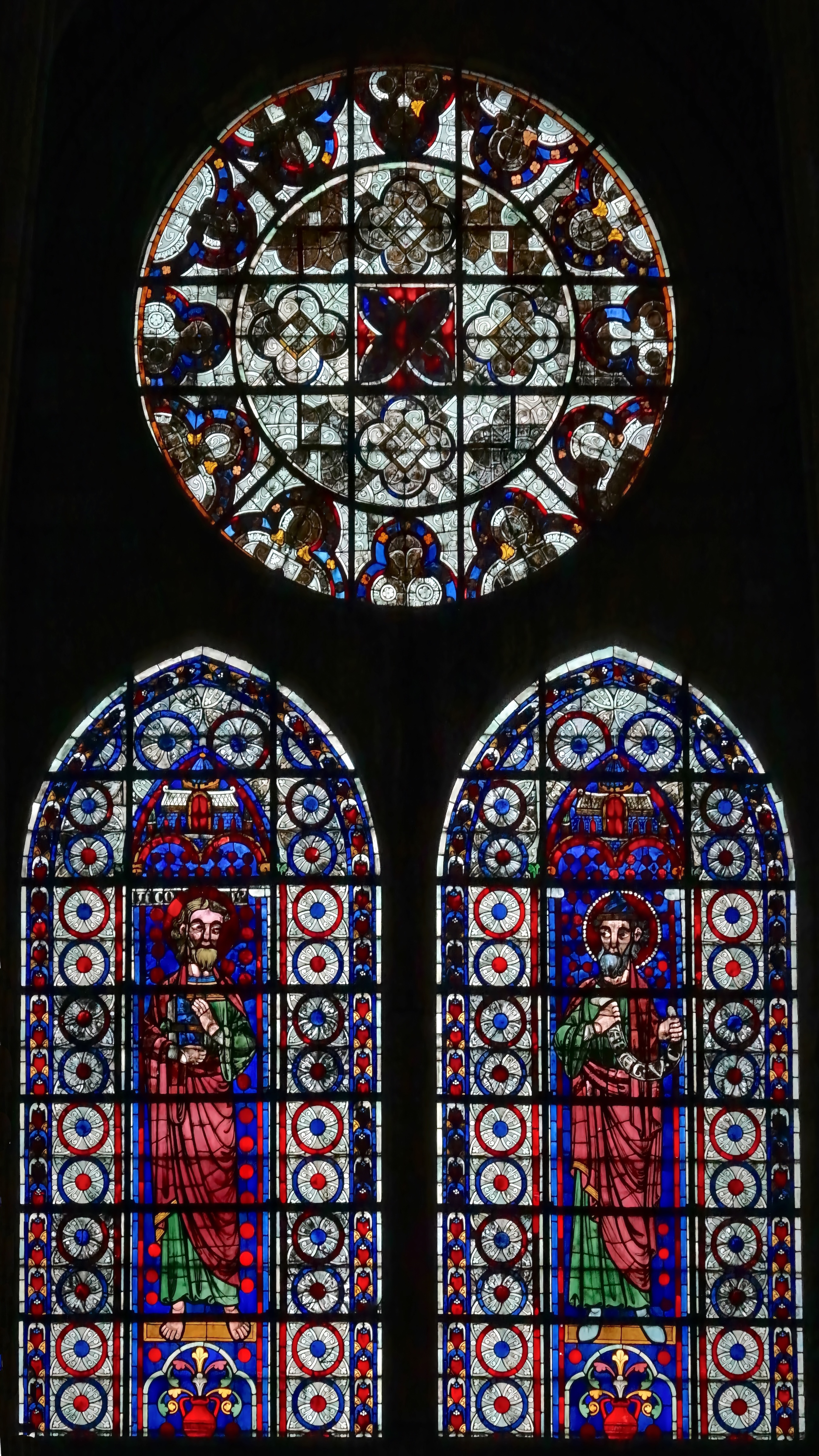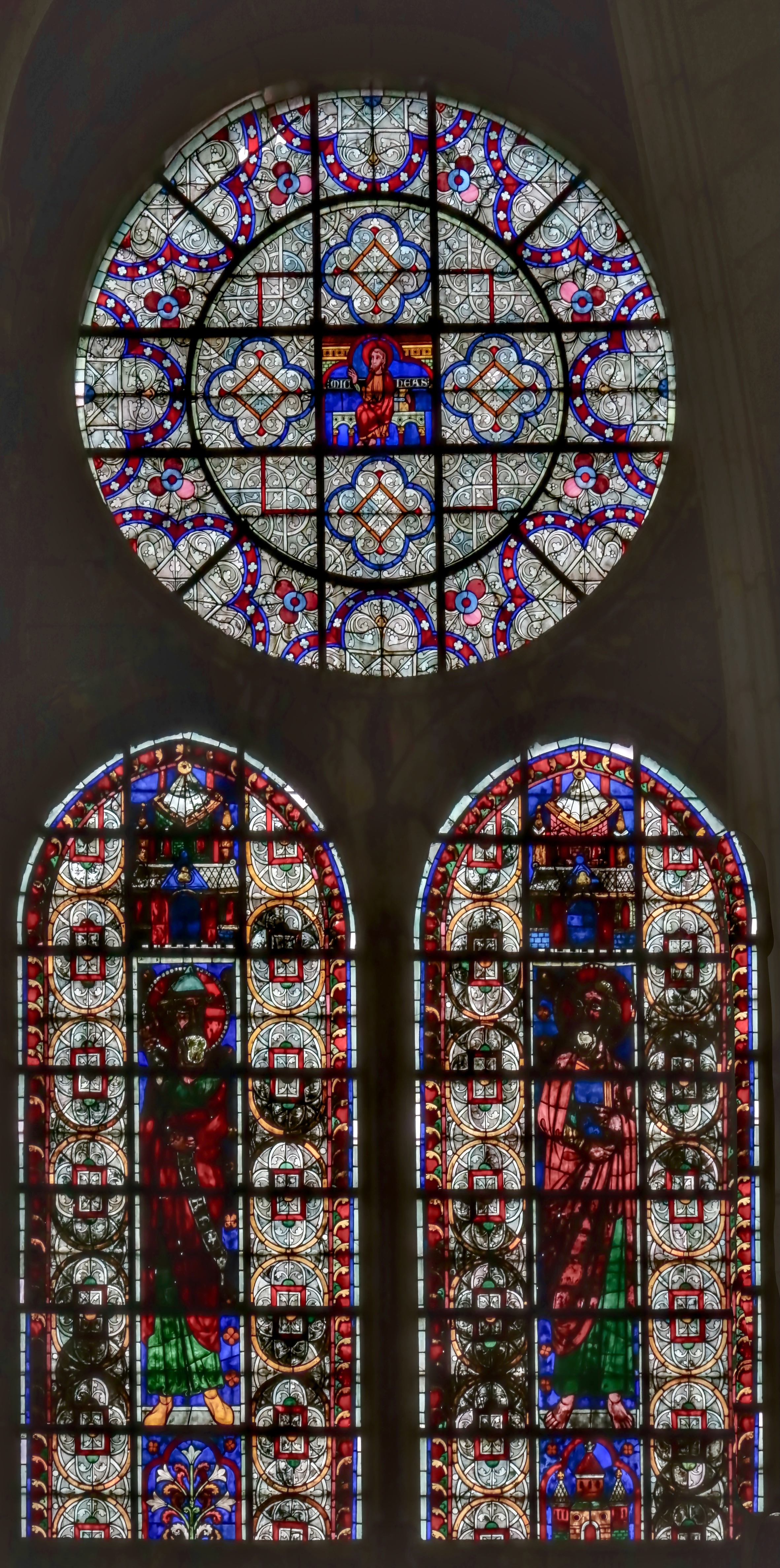 Les hautes baies du chœur renferment des vitraux du 13e siècle. On y voit des apôtres, des prophètes, des saints, et, dans les rosaces des deux baies voisines de la baie centrale, la représentation, à gauche, des Vertus et des Vices, à droite, des Arts libéraux.